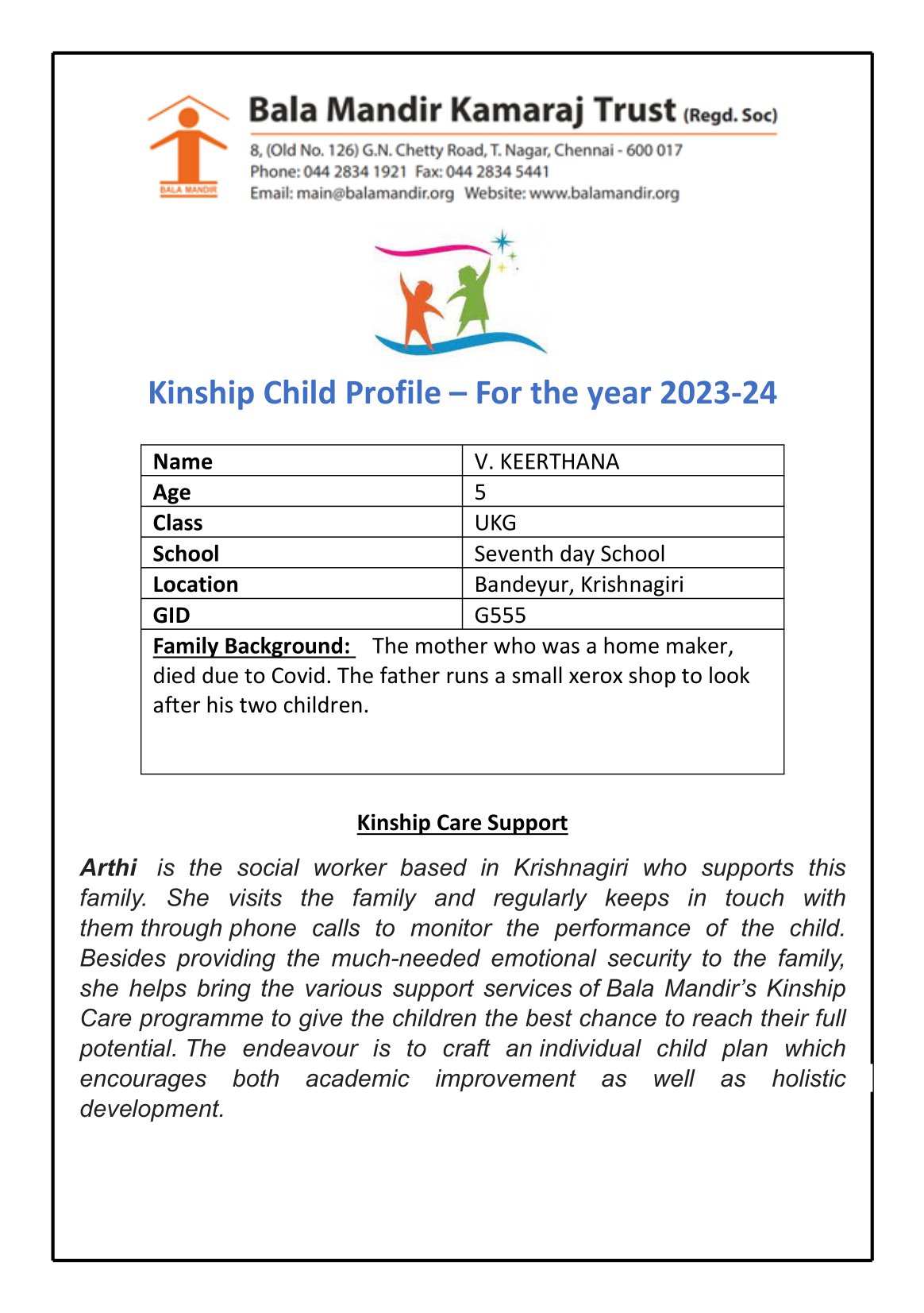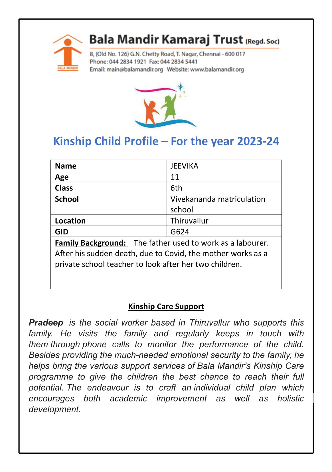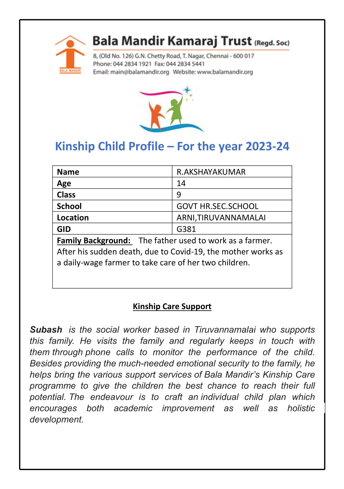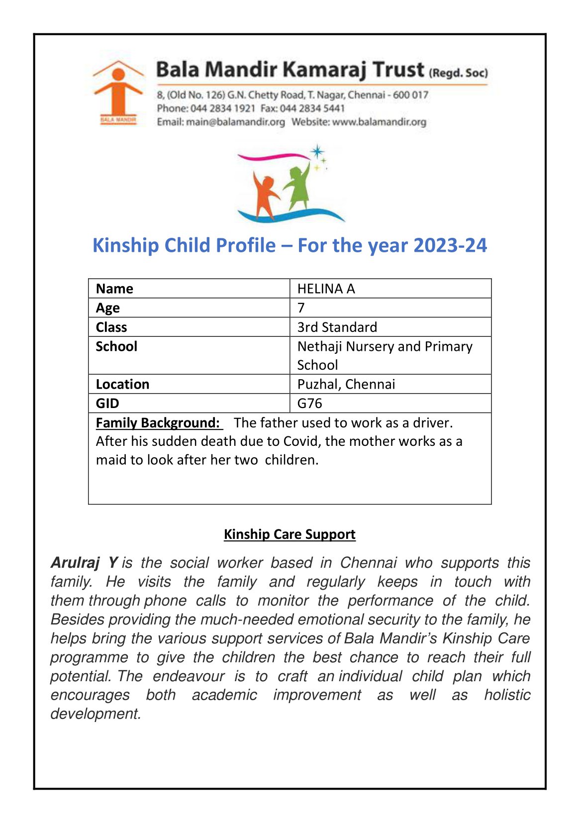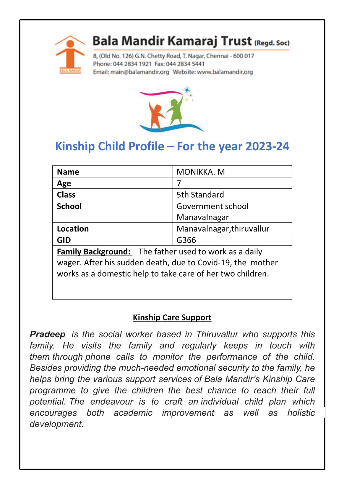 My name is P Natarajan. I am the Trustee and Treasurer of Bala Mandir Kamaraj Trust and we started the Kinship Care program after studying the setbacks faced by the children who suddenly lost one or both of their parents.