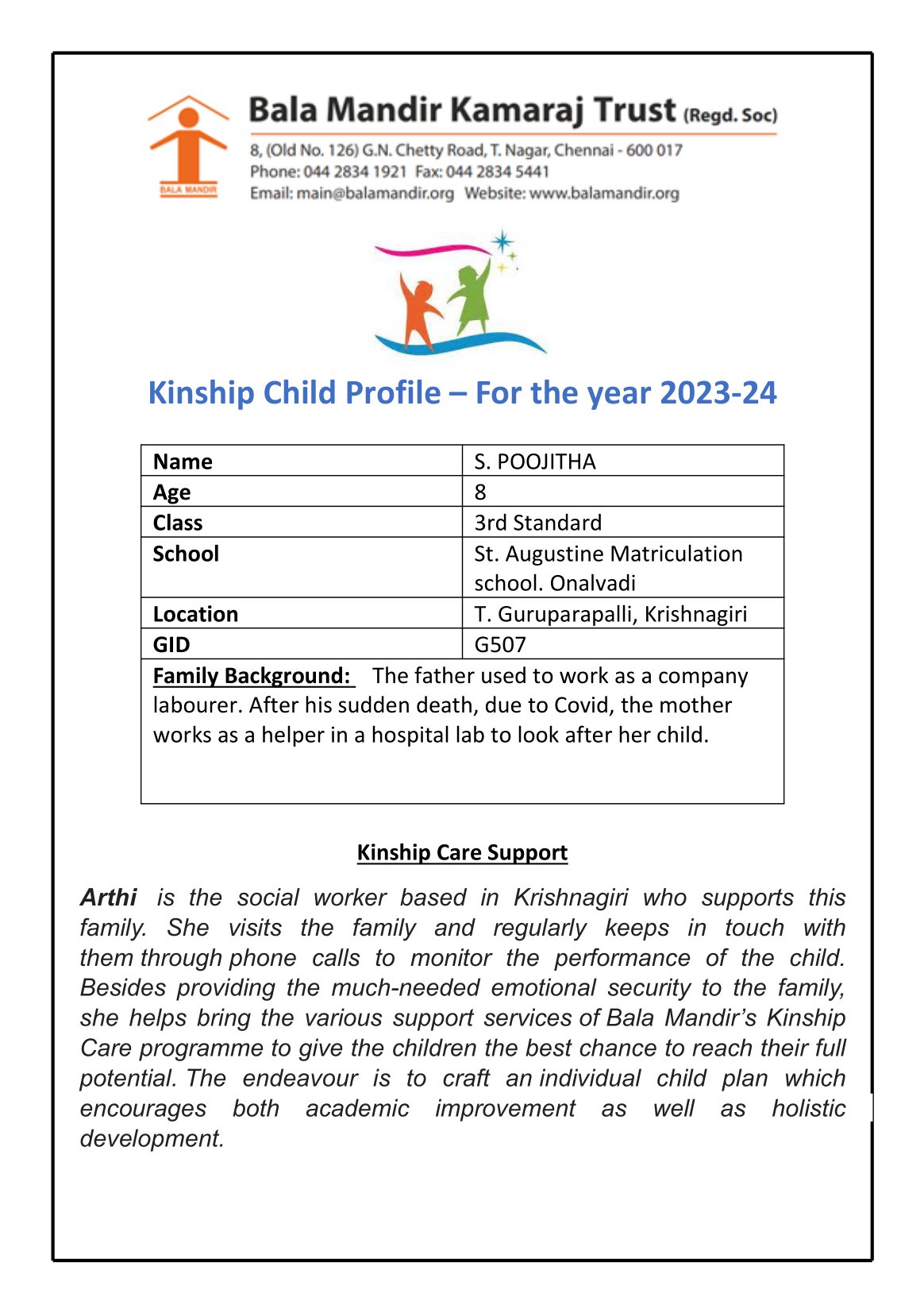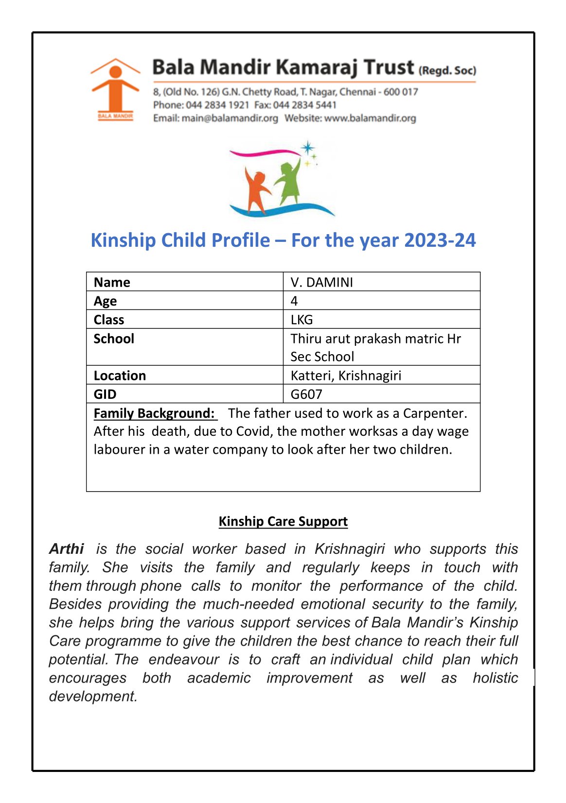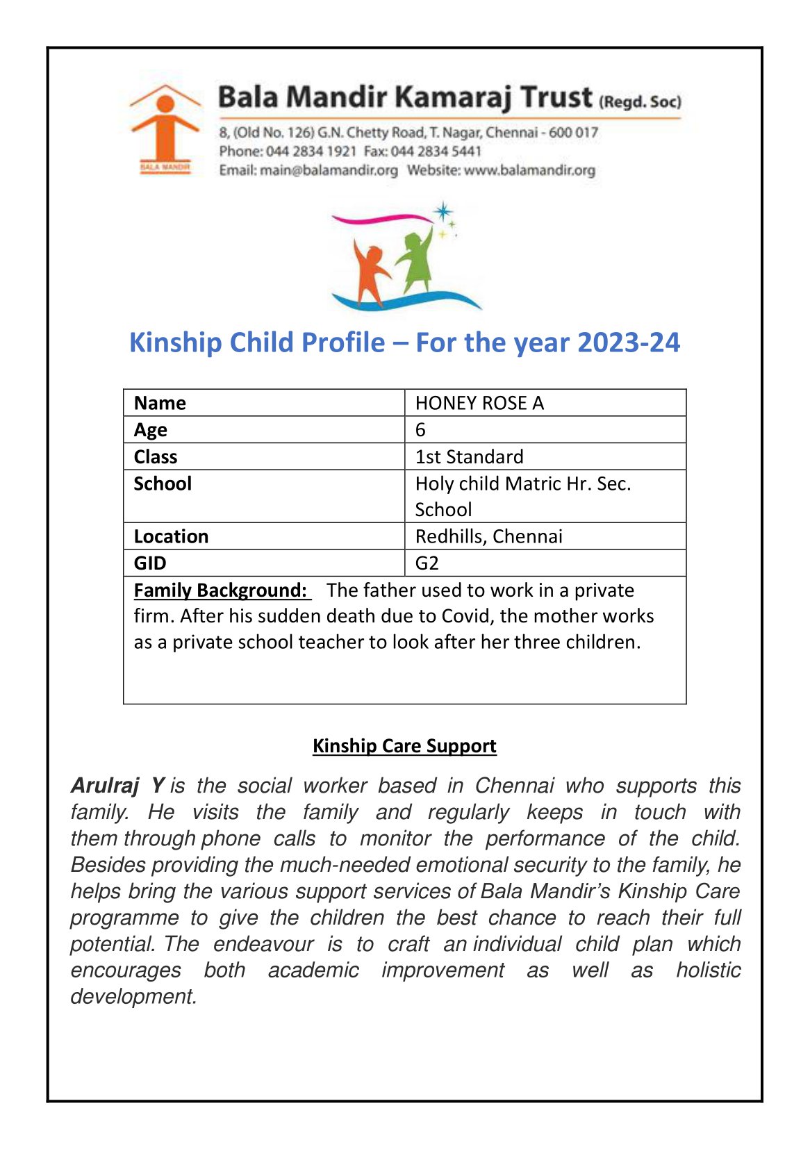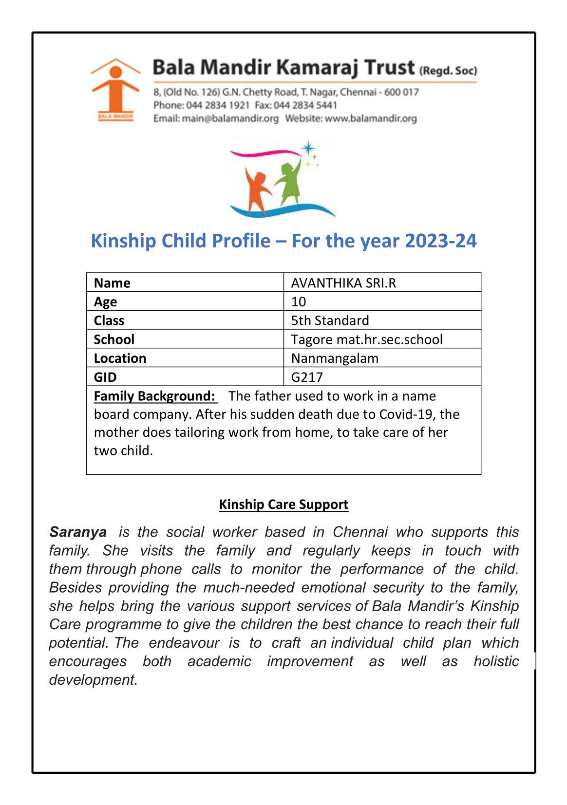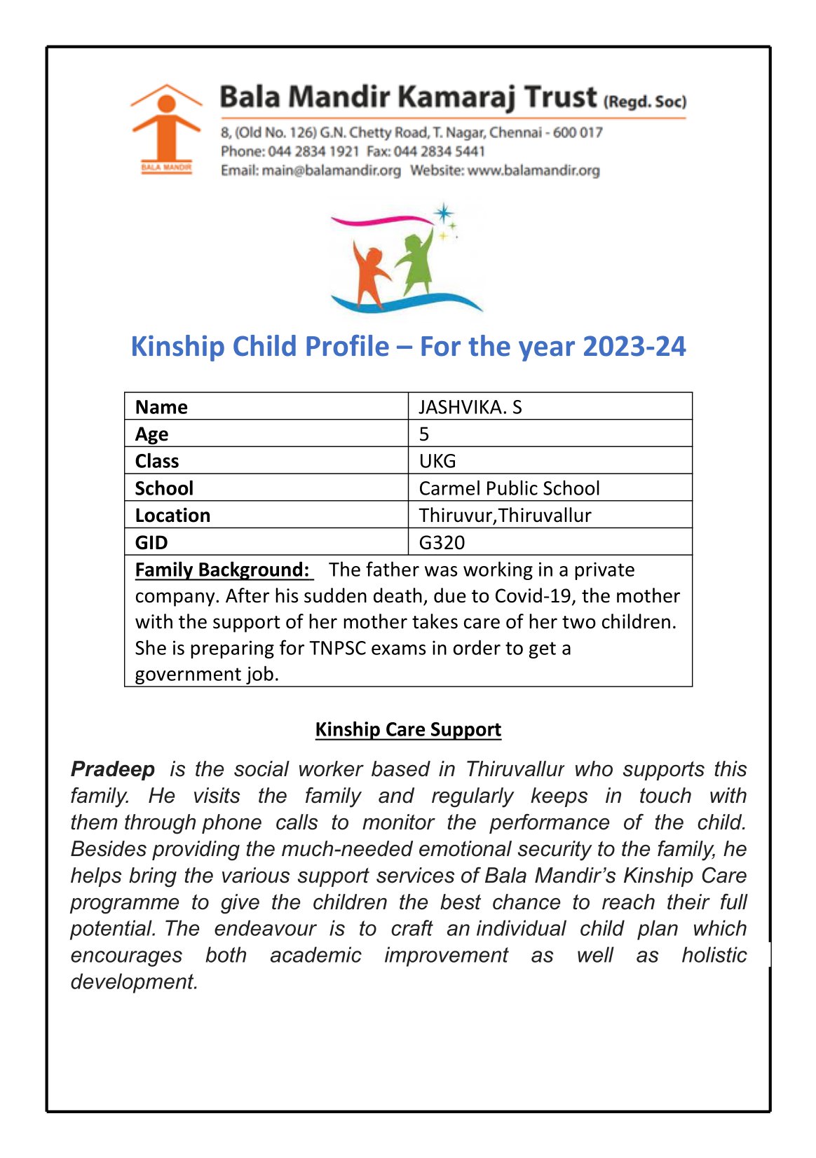 My name is P Natarajan. I am the Trustee and Treasurer of Bala Mandir Kamaraj Trust and we started the Kinship Care program after studying the setbacks faced by the children who suddenly lost one or both of their parents.