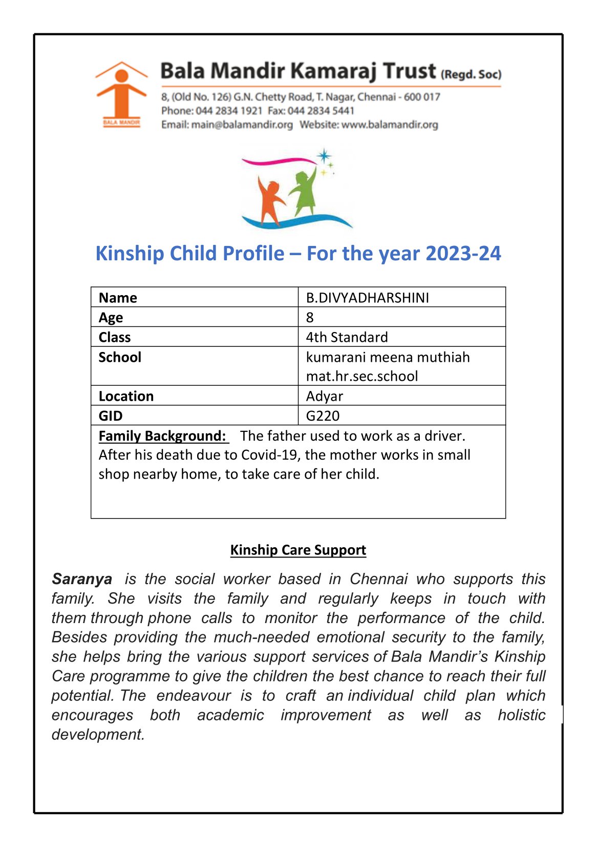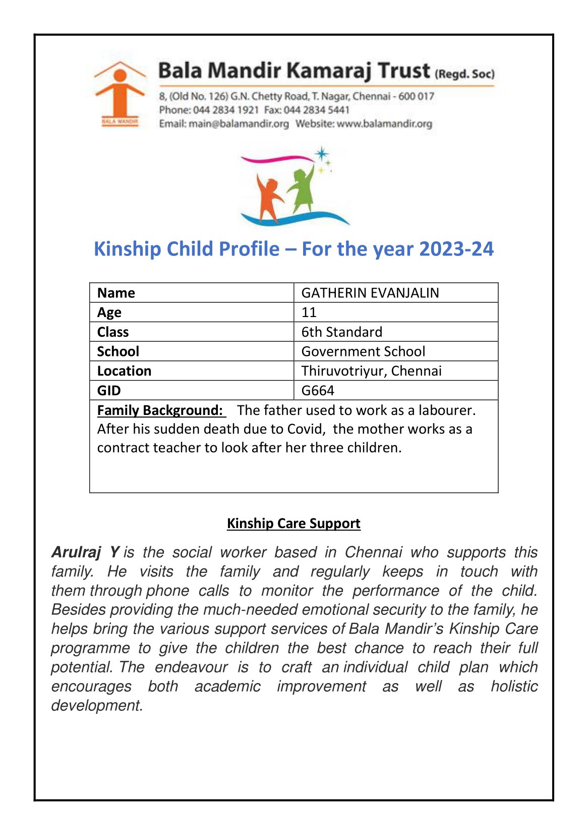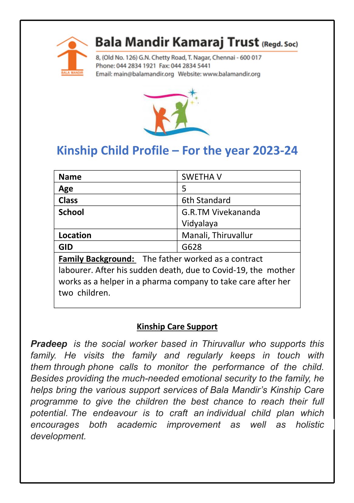 In July 2021 with the pandemic looming large and the world gripped by fear, shock, and uncertainty; Bala Mandir took the plunge to help orphaned children in need. To get started the list of Covid orphans was received from the office of the District Child Protection Officer in Chennai and the nearby districts. Using this list a few existing social workers of Bala Mandir were asked to visit the families to find out their status and need for support including possible admission in Bala Mandir homes.