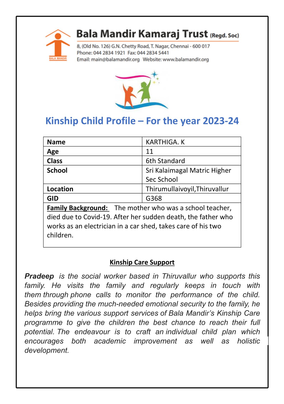 The Chennai-based NGO - Bala Mandir Kamaraj Trust has come up with a unique initiative called “Kinship Care” to address this problem. This is being done in 9 districts of Tamil Nadu currently and is already impacting a massive 800 children. All it takes is INR 20,000 to impact a child for an entire year. Read this story to understand how this program works and fund generously. All funding has 80G tax benefits.