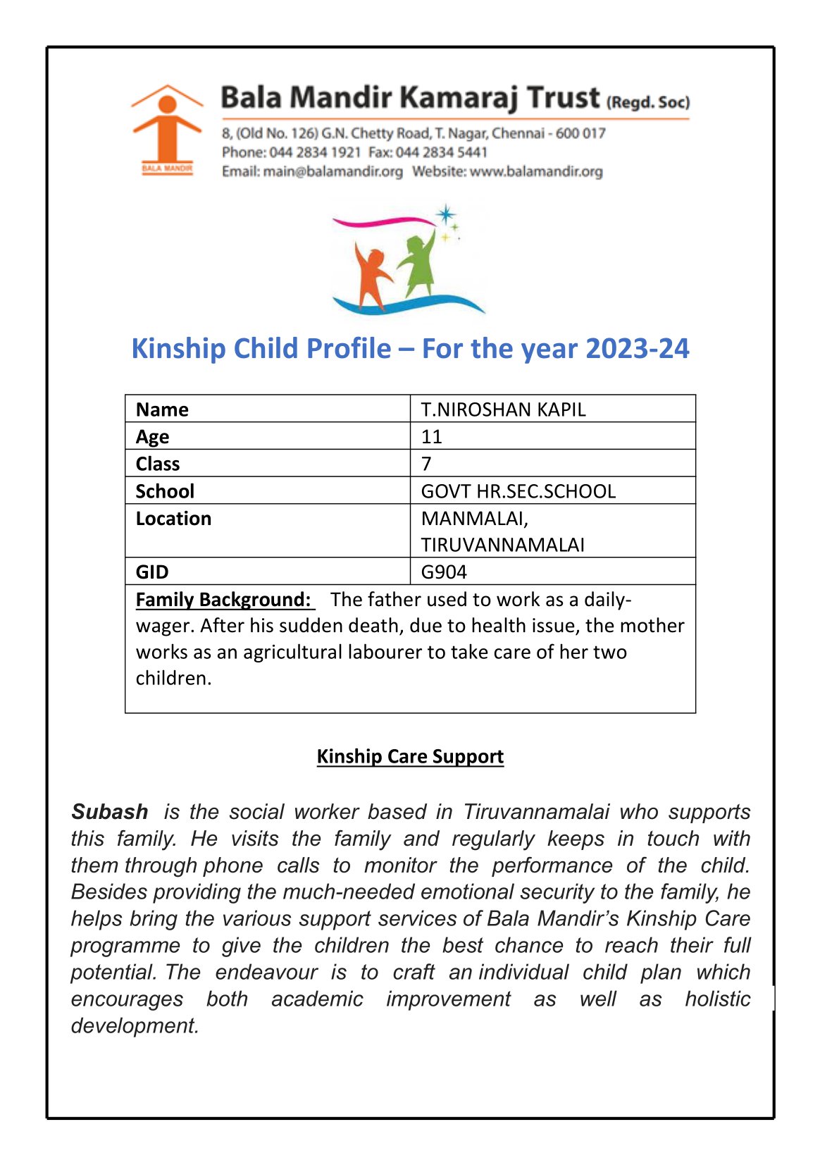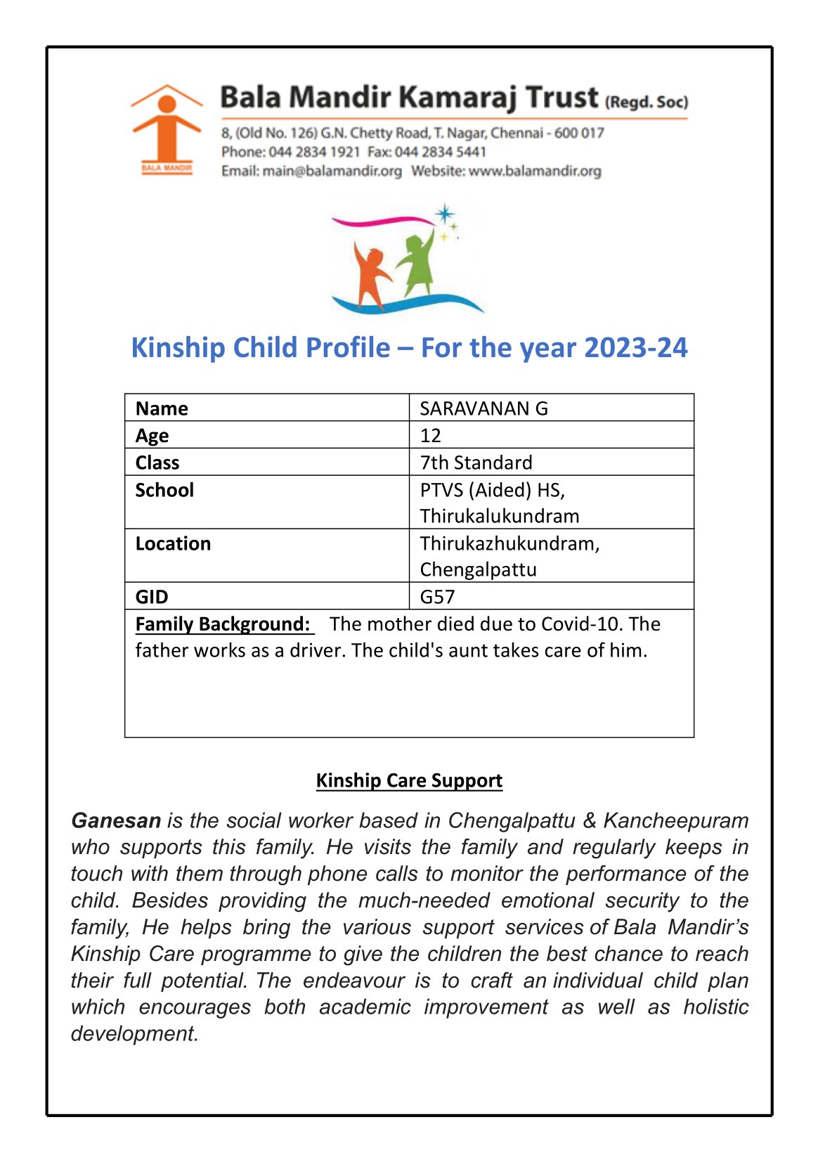 ABOUT THE BALA MANDIR KAMARAJ TRUST (BMKT):