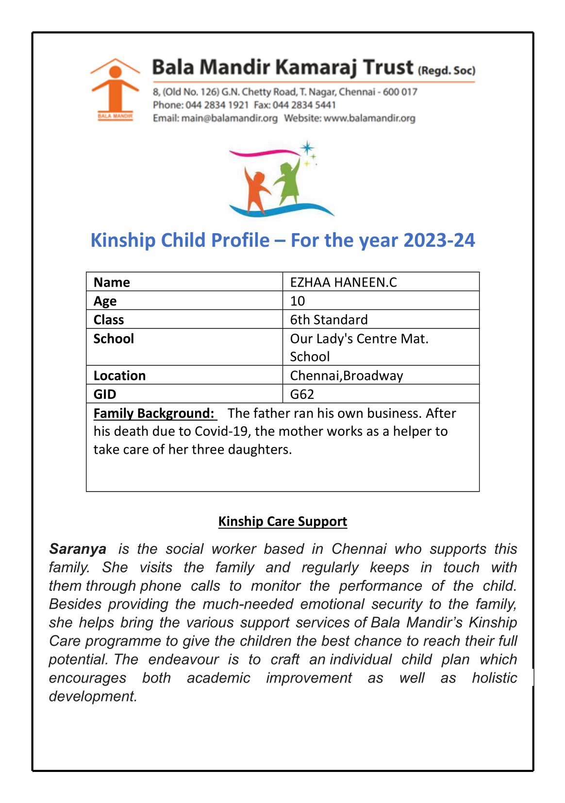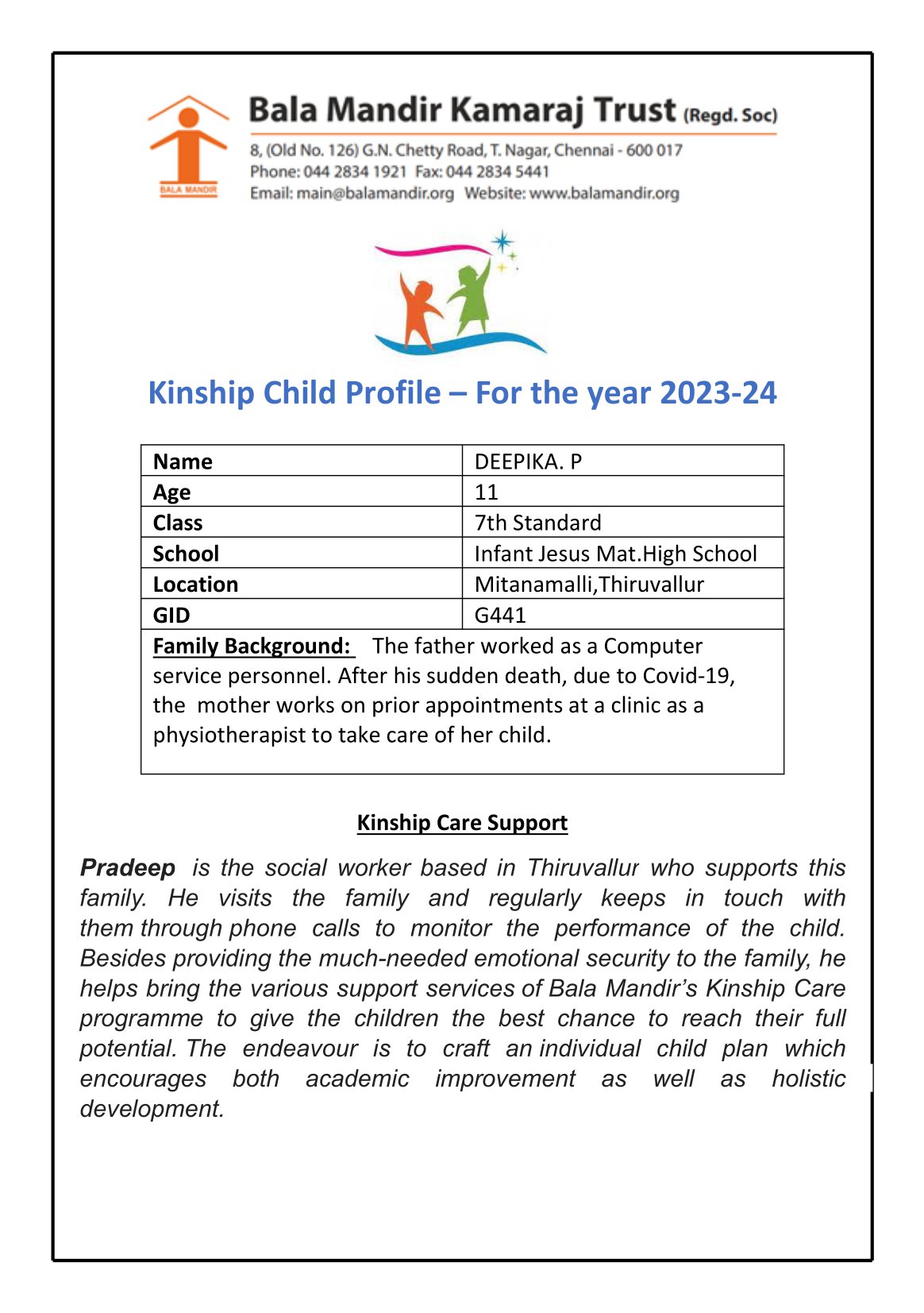 In July 2021 with the pandemic looming large and the world gripped by fear, shock, and uncertainty; Bala Mandir took the plunge to help orphaned children in need. To get started the list of Covid orphans was received from the office of the District Child Protection Officer in Chennai and the nearby districts. Using this list a few existing social workers of Bala Mandir were asked to visit the families to find out their status and need for support including possible admission in Bala Mandir homes.
