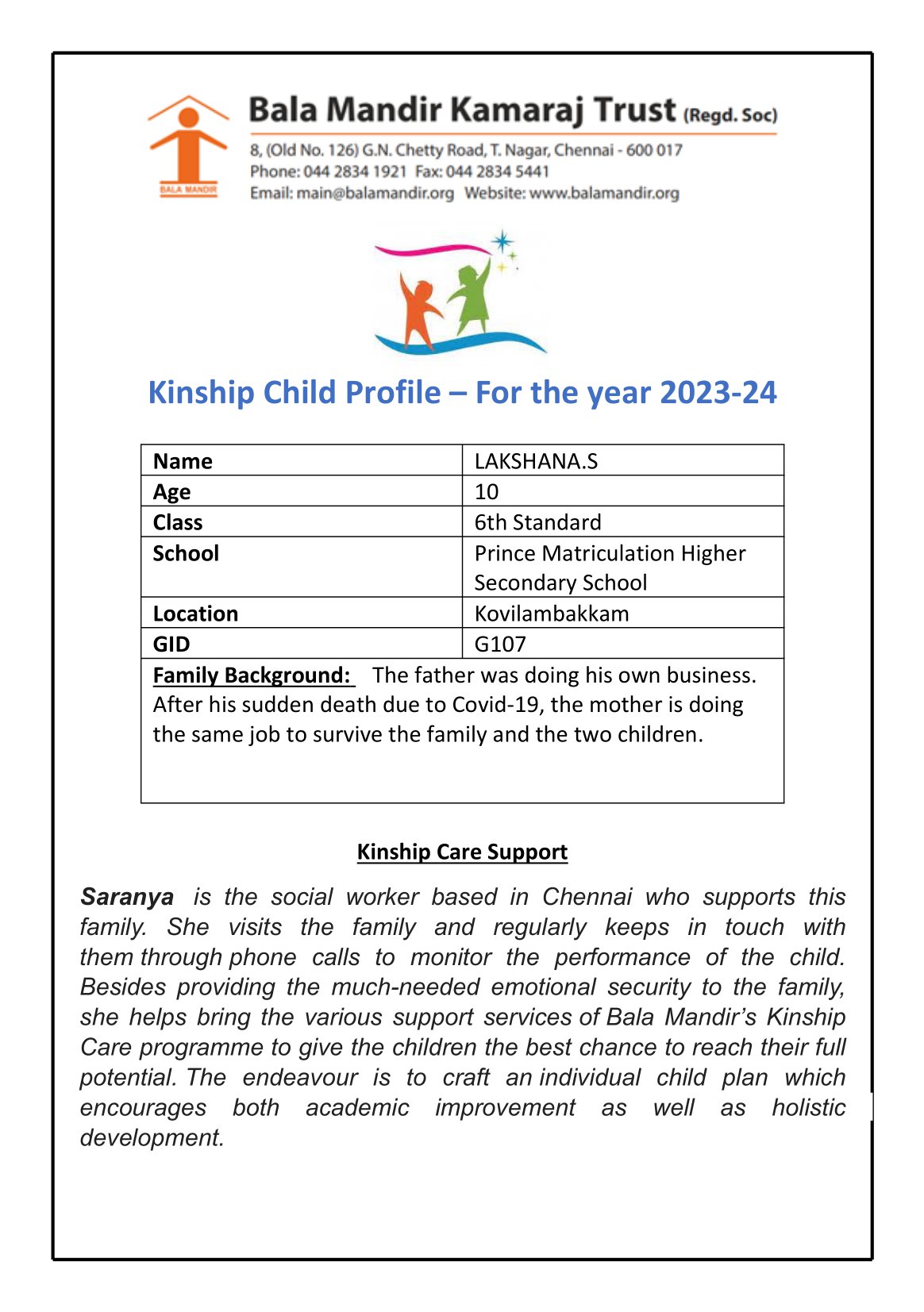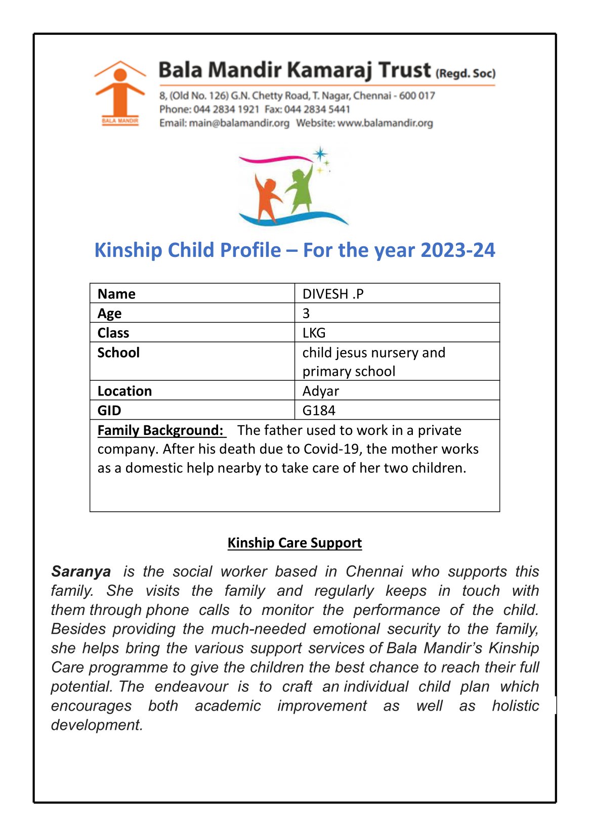 In July 2021 with the pandemic looming large and the world gripped by fear, shock, and uncertainty; Bala Mandir took the plunge to help orphaned children in need. To get started the list of Covid orphans was received from the office of the District Child Protection Officer in Chennai and the nearby districts. Using this list a few existing social workers of Bala Mandir were asked to visit the families to find out their status and need for support including possible admission in Bala Mandir homes.