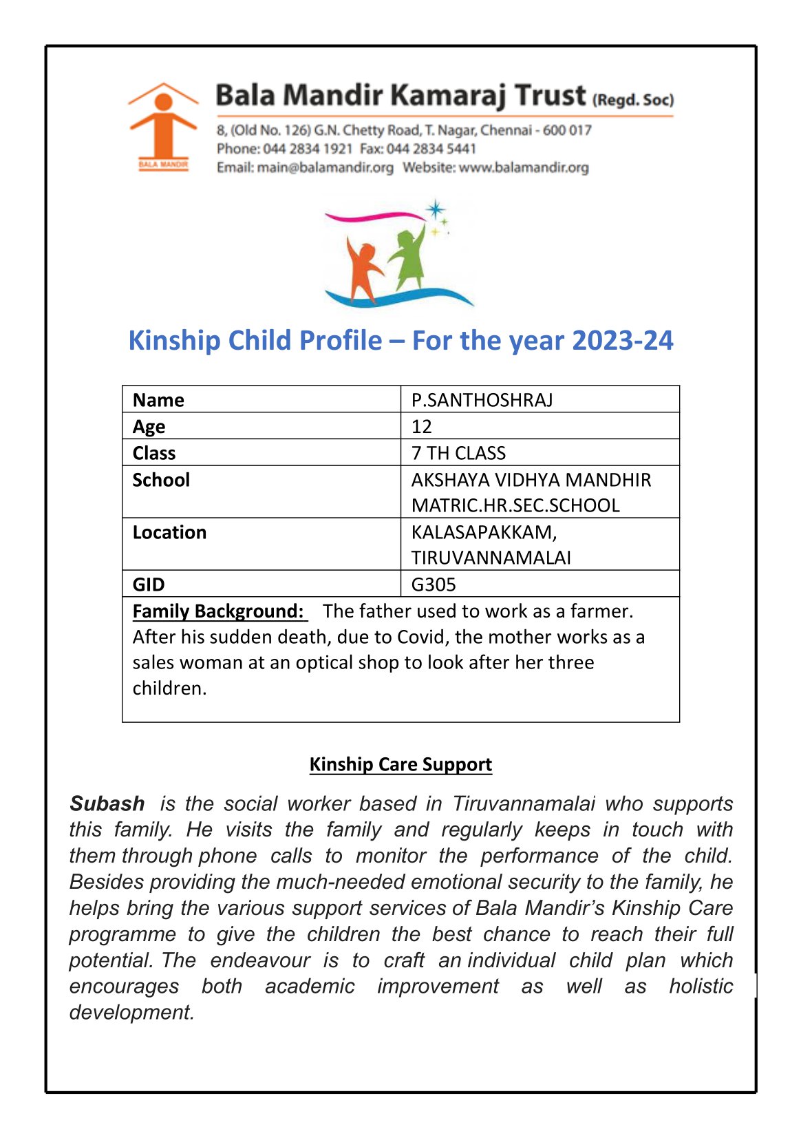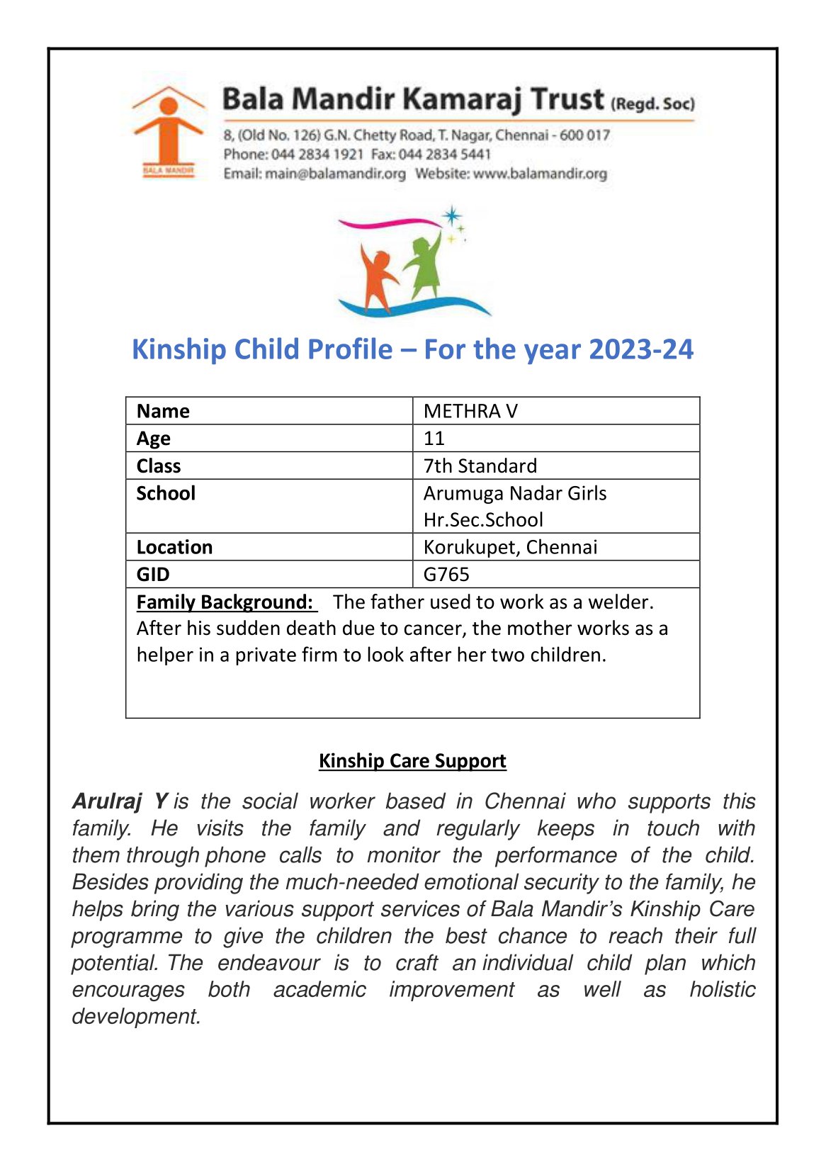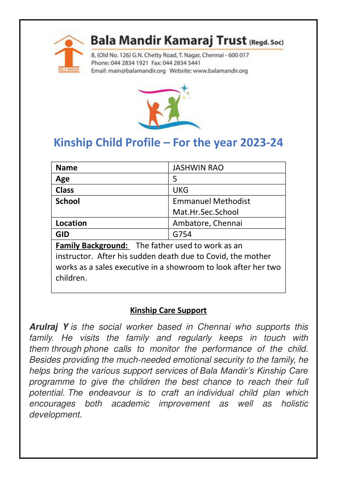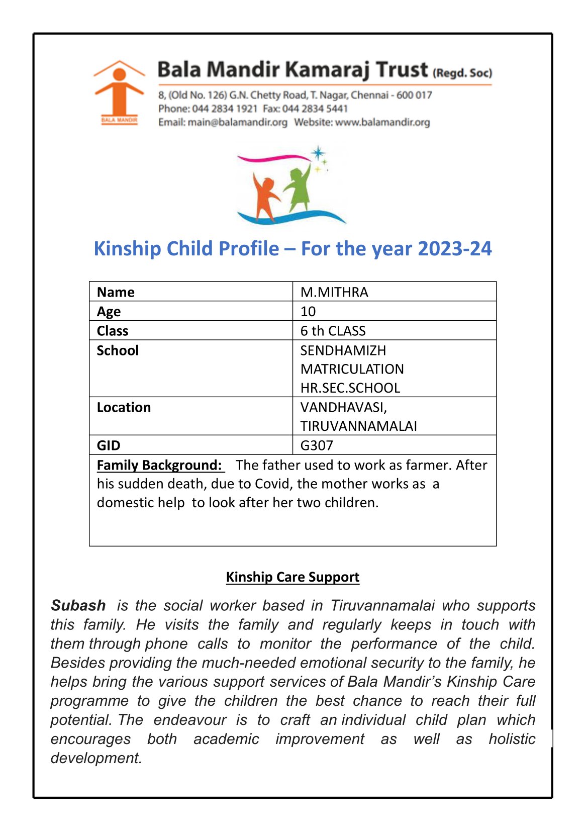 ABOUT THE BALA MANDIR KAMARAJ TRUST (BMKT):