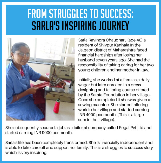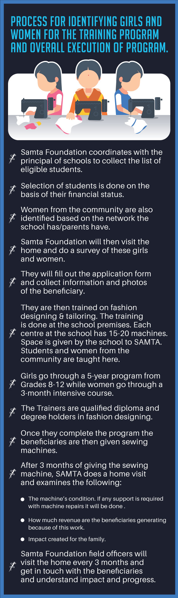 The Rotary Club of Bombay Hanging Garden and the Inner Wheel Club of Bombay Hanging Garden are partnering with the SAMTA FOUNDATION to execute this initiative. They are committed to helping these young girls and women. They will provide fashion design and tailoring expertise plus provide sewing machines to these young girls and women upon completion of the training. Each young girl and woman would receive a kit consisting of a sewing machine and a stand.