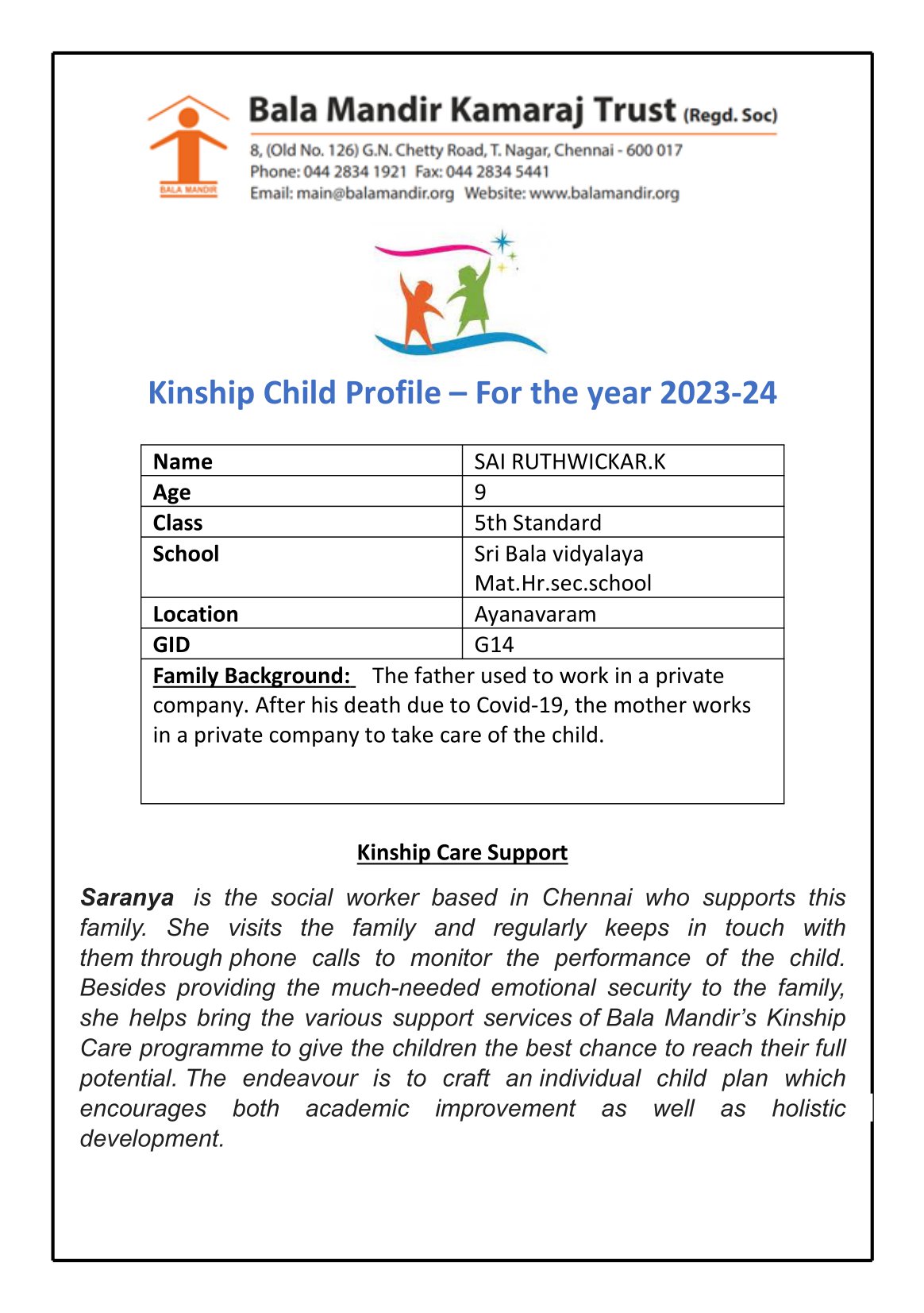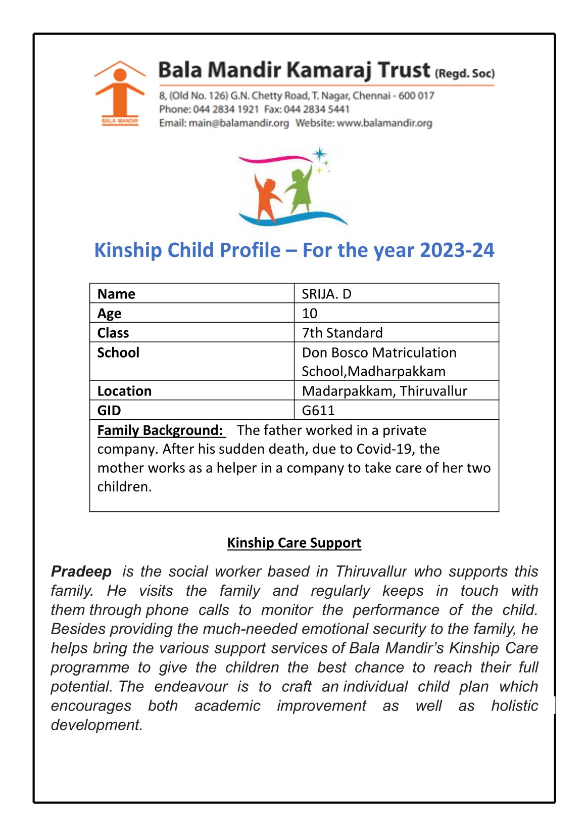 In July 2021 with the pandemic looming large and the world gripped by fear, shock, and uncertainty; Bala Mandir took the plunge to help orphaned children in need. To get started the list of Covid orphans was received from the office of the District Child Protection Officer in Chennai and the nearby districts. Using this list a few existing social workers of Bala Mandir were asked to visit the families to find out their status and need for support including possible admission in Bala Mandir homes.