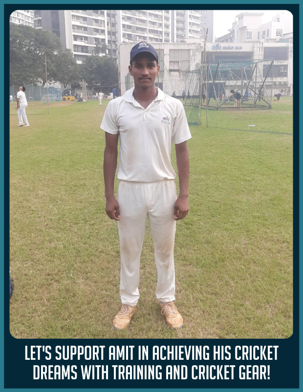 I want to ease the financial burden on Amit's family by raising funds for his cricket kit (costing around INR 20,000) and six months of coaching at the prestigious MIG Cricket Club in Bandra, Mumbai (INR 23,600).