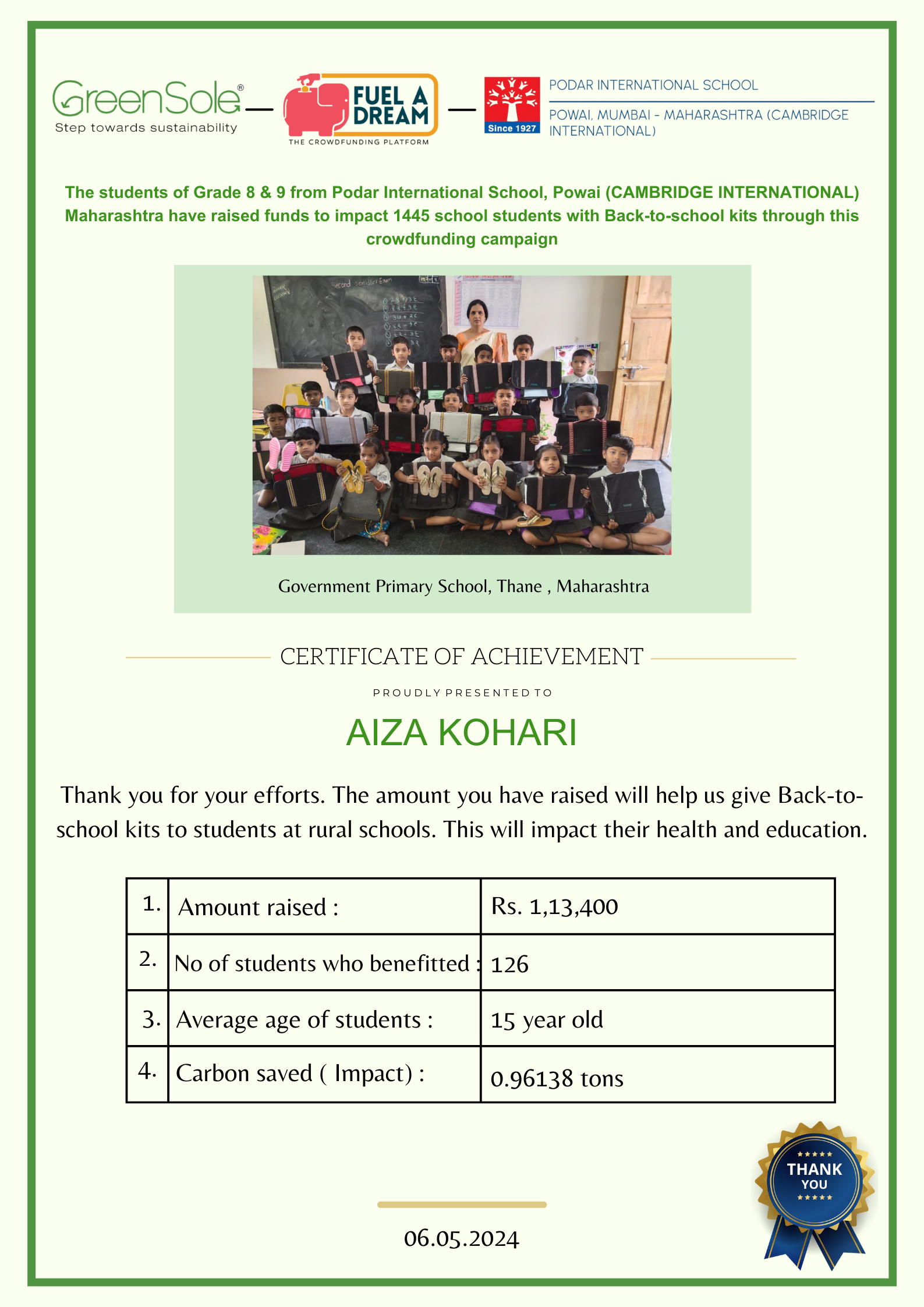 My name is Aiza Kohari. I am 13-years-old and a Grade 8 student at Podar International School, Powai, Mumbai.