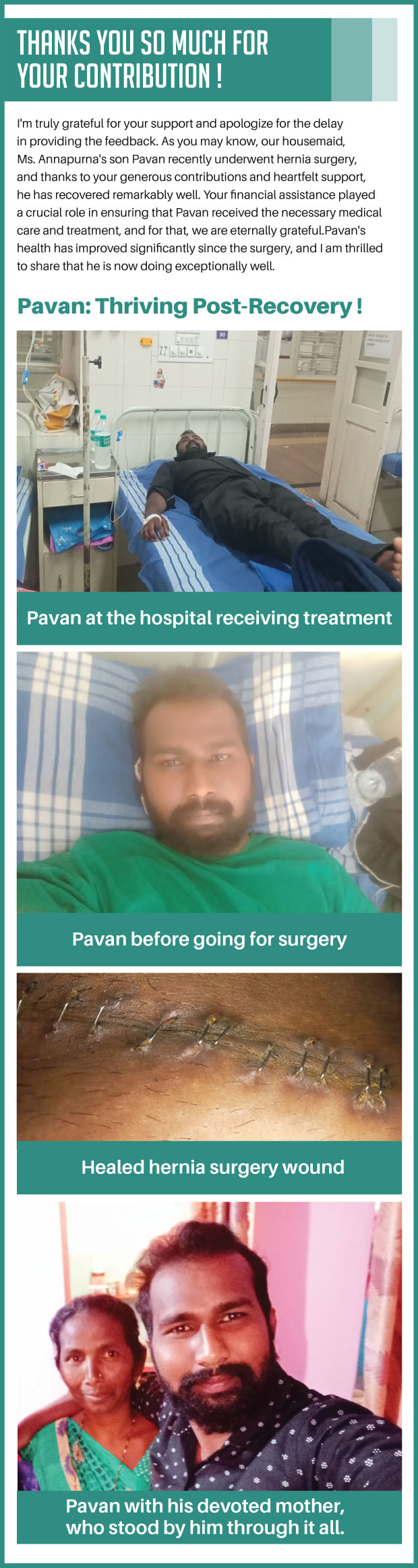 Annapurna, our dedicated house helper for over a decade, became the sole provider to her family after her husband's passing. Her son Pavan, who took responsibility for the family and was working hard in getting his life back on track took a turn when he was diagnosed with a critical prostate hernia. They are in need of urgent financial support for Pavan's life-saving surgery.