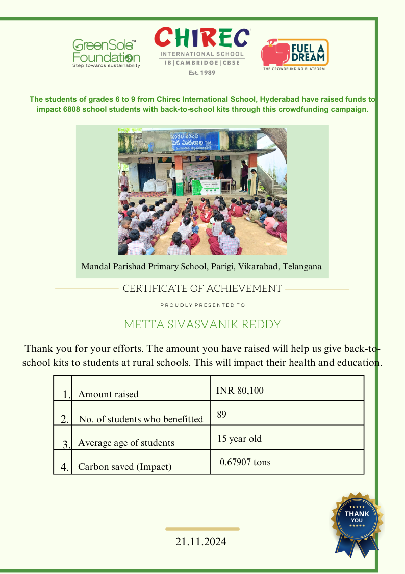 My name is METTA SIVASVANIK REDDY . I am 13-years-old and a Grade 9 student at Chirec Intl School (IB), Hyderabad, Telangana.