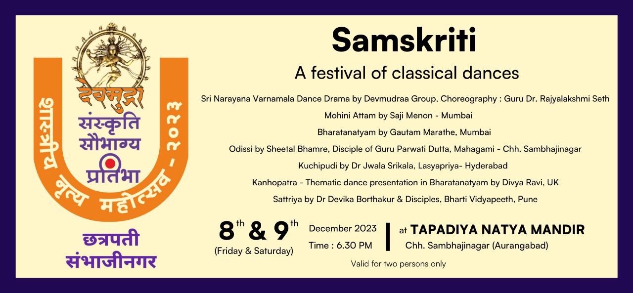 On December 8th and 9th, 2023, the Samskriti-2023 festival will take place at Tapadiya Natya Mandir in Chh. Sambhajinagar in Aurangabad.