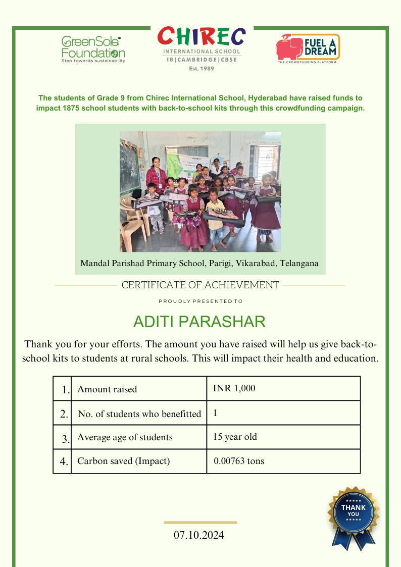 My name is Aditi Parashar. I am 14 years old and a Grade 9 student at the Chirec International School (CBSE), Hyderabad.