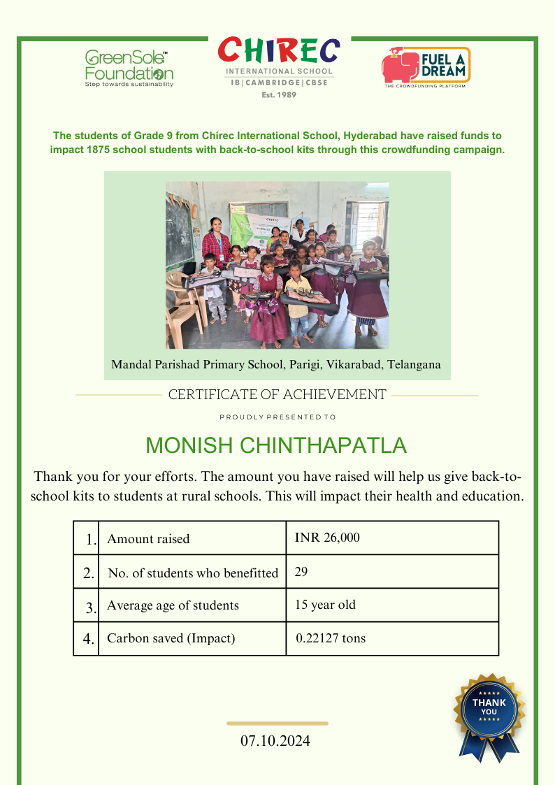 My name is Monish Chinthapatla. I am 14 years-old and a Grade 9 student at the Chirec International School (CBSE), Hyderabad.