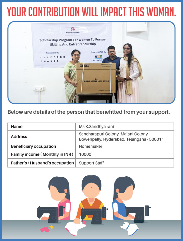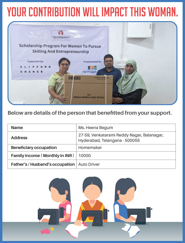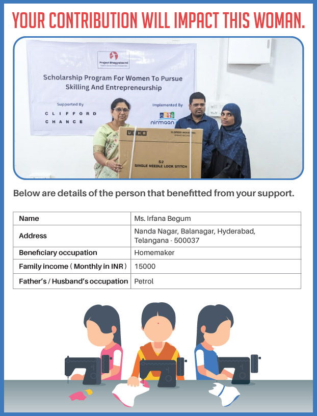 Nirmaan Organization, an NGO based in Hyderabad is helping women establish a livelihood so that they can be independent and support their families. The NGO provides sewing classes to these underprivileged women at Nirmaan training centers in Hyderabad. This campaign aims to provide sewing machines to these women who have completed the training. Each woman would receive a livelihood kit consisting of a sewing machine, stand, and other accessories and would own these items.