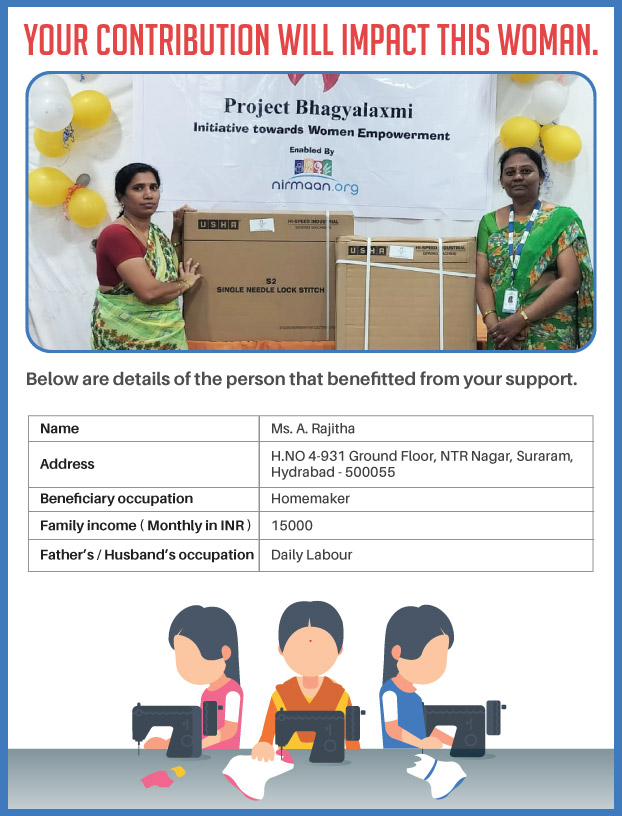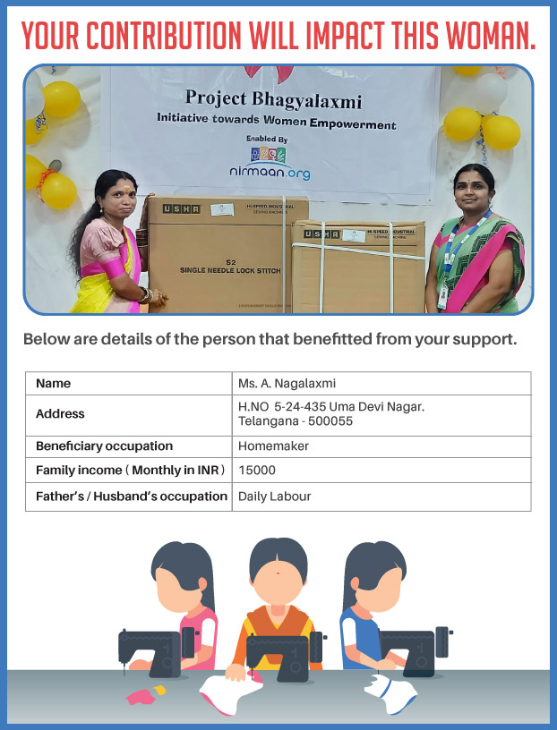Nirmaan Organization, an NGO based in Hyderabad is helping women establish a livelihood so that they can be independent and support their families. The NGO provides sewing classes to these underprivileged women at Nirmaan training centers in Hyderabad. This campaign aims to provide sewing machines to these women who have completed the training. Each woman would receive a livelihood kit consisting of a sewing machine, stand, and other accessories and would own these items.
