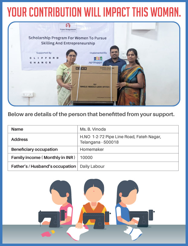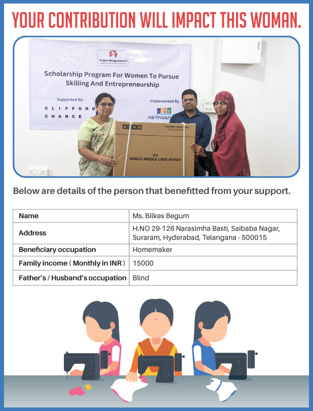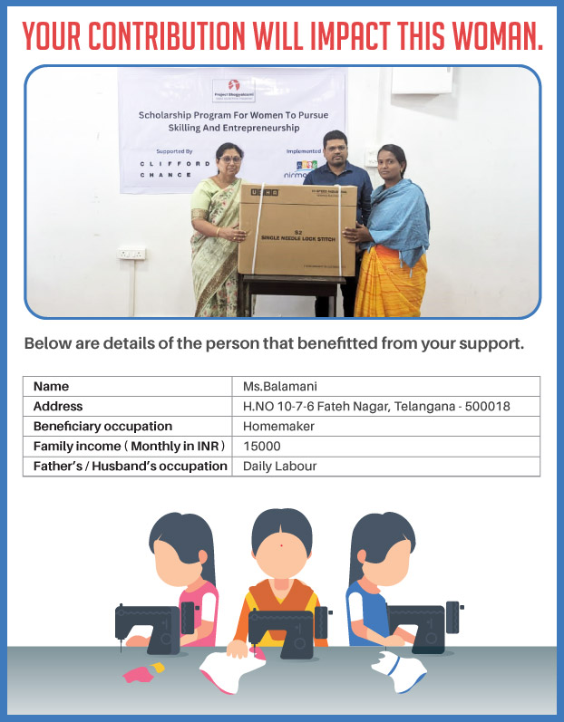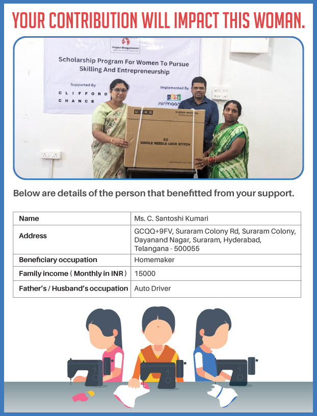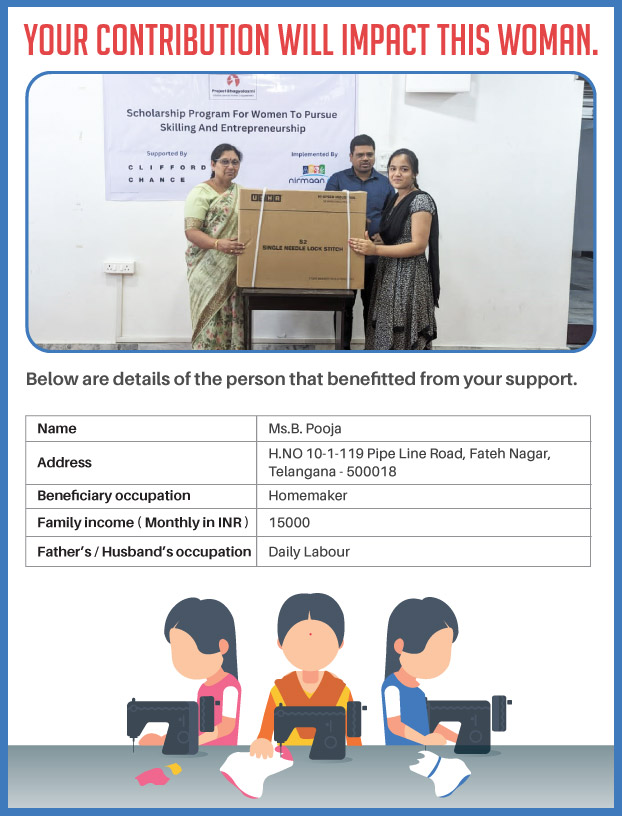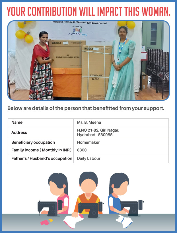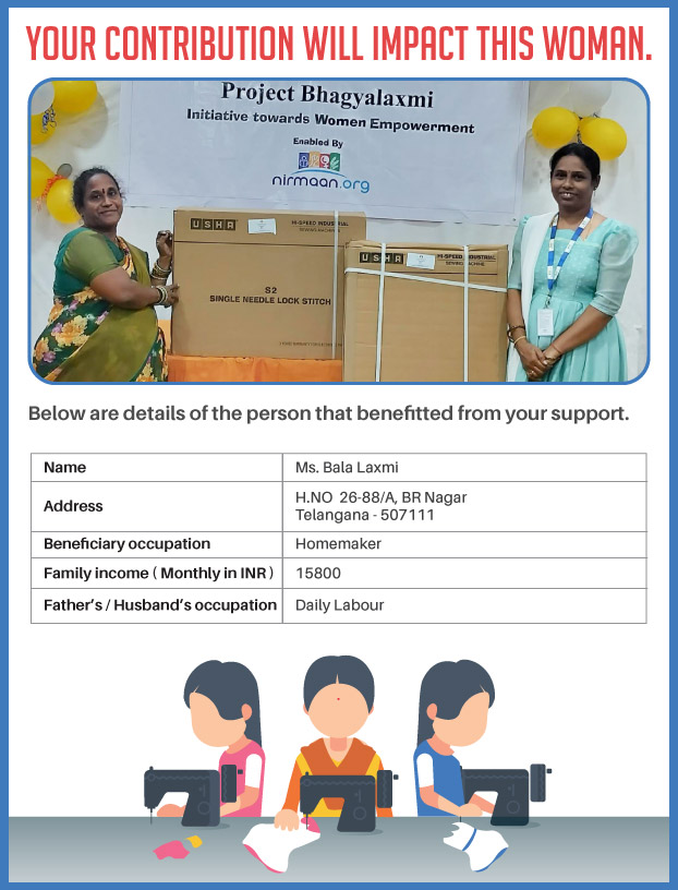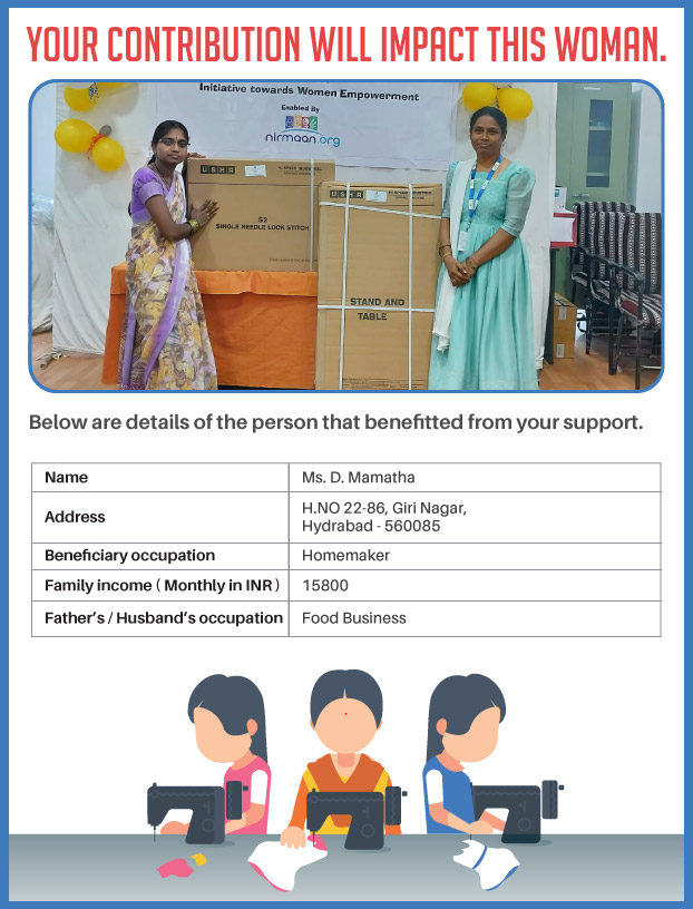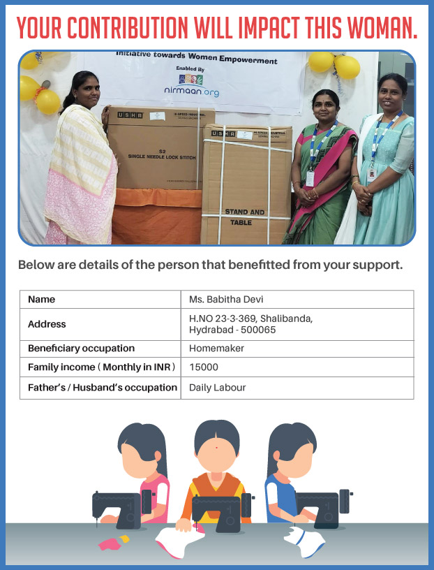 Nirmaan Organization, an NGO based in Hyderabad is helping women establish a livelihood so that they can be independent and support their families. The NGO provides sewing classes to these underprivileged women at Nirmaan training centers in Hyderabad. This campaign aims to provide sewing machines to these women who have completed the training. Each woman would receive a livelihood kit consisting of a sewing machine, stand, and other accessories and would own these items.