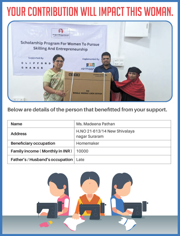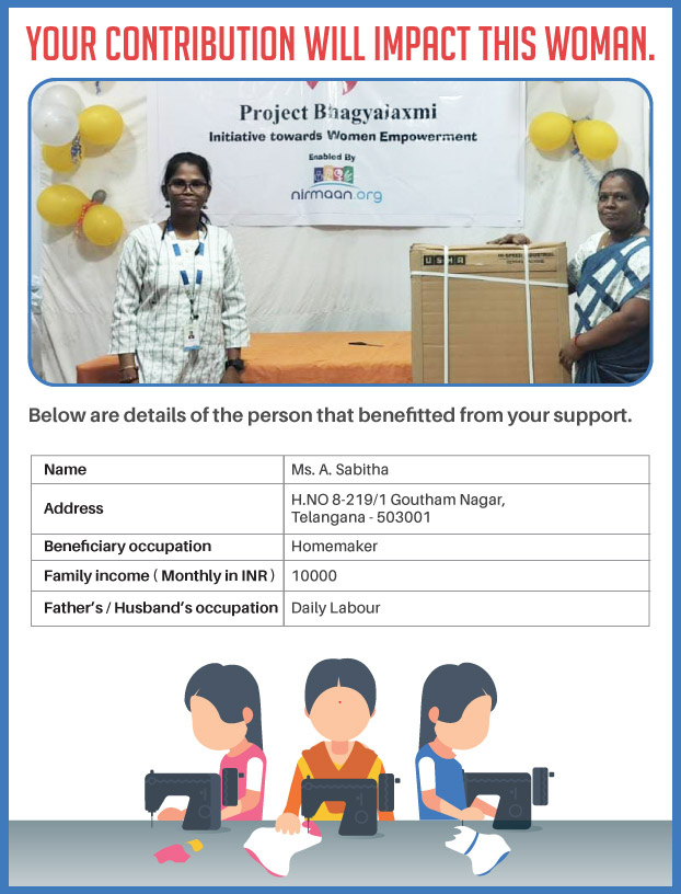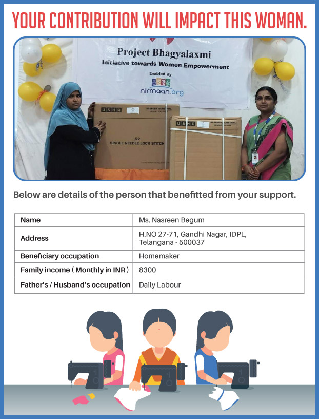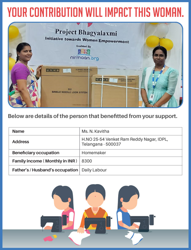 Nirmaan Organization, an NGO based in Hyderabad is helping women establish a livelihood so that they can be independent and support their families. The NGO provides sewing classes to these underprivileged women at Nirmaan training centers in Hyderabad. This campaign aims to provide sewing machines to these women who have completed the training. Each woman would receive a livelihood kit consisting of a sewing machine, stand, and other accessories and would own these items.