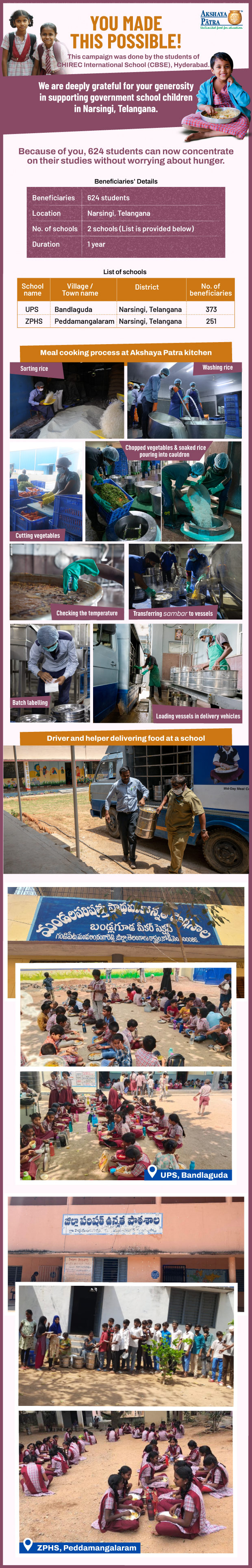 The “Akshaya Patra's mid-day meal program”, not only motivates students to go to school but also ensures that they are attentive at school. It impacts attendance, health and grades at school.