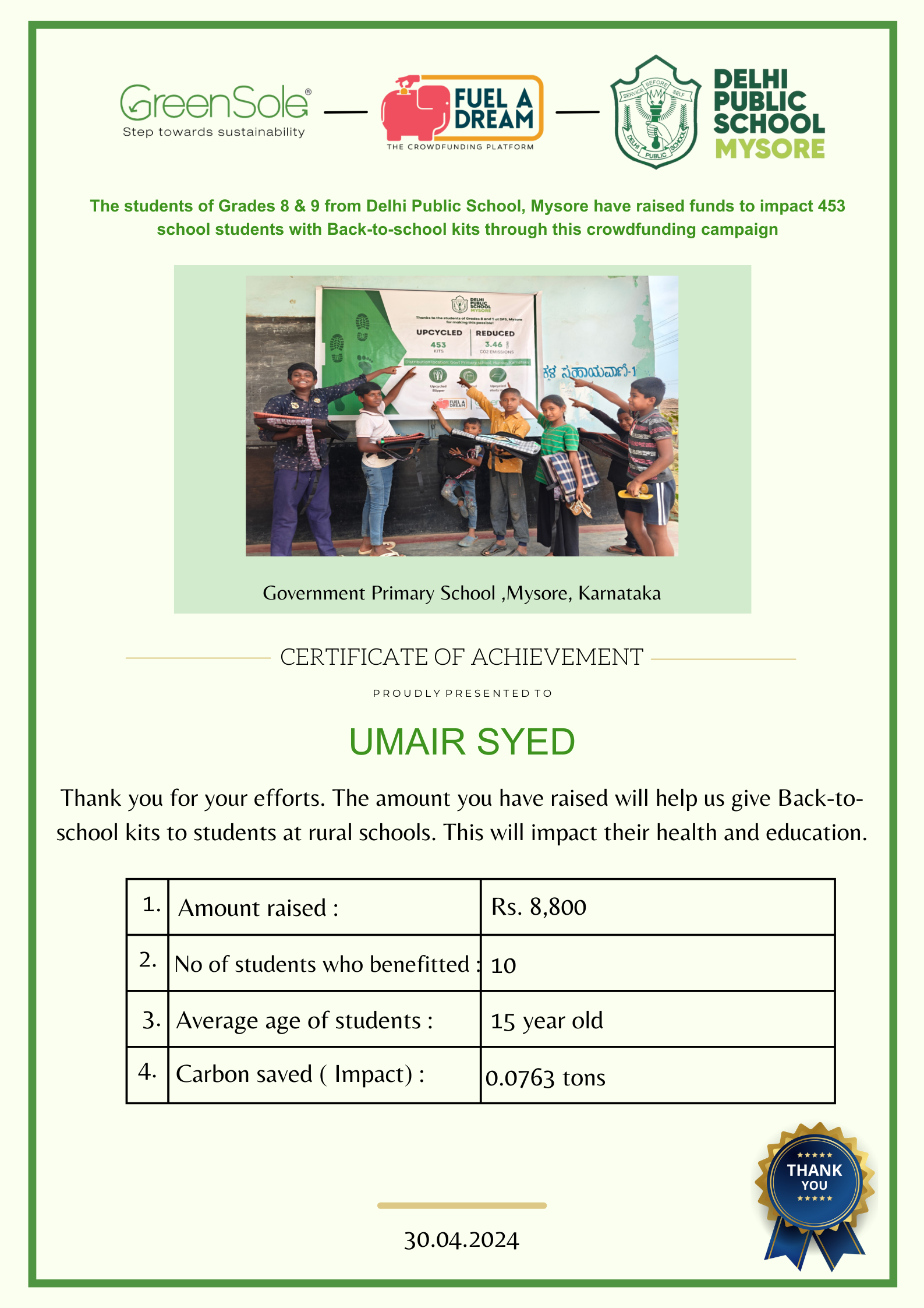 My name is UMAIR SYED. I am 14-years-old and a Grade 9 student at Delhi Public School, Mysore.