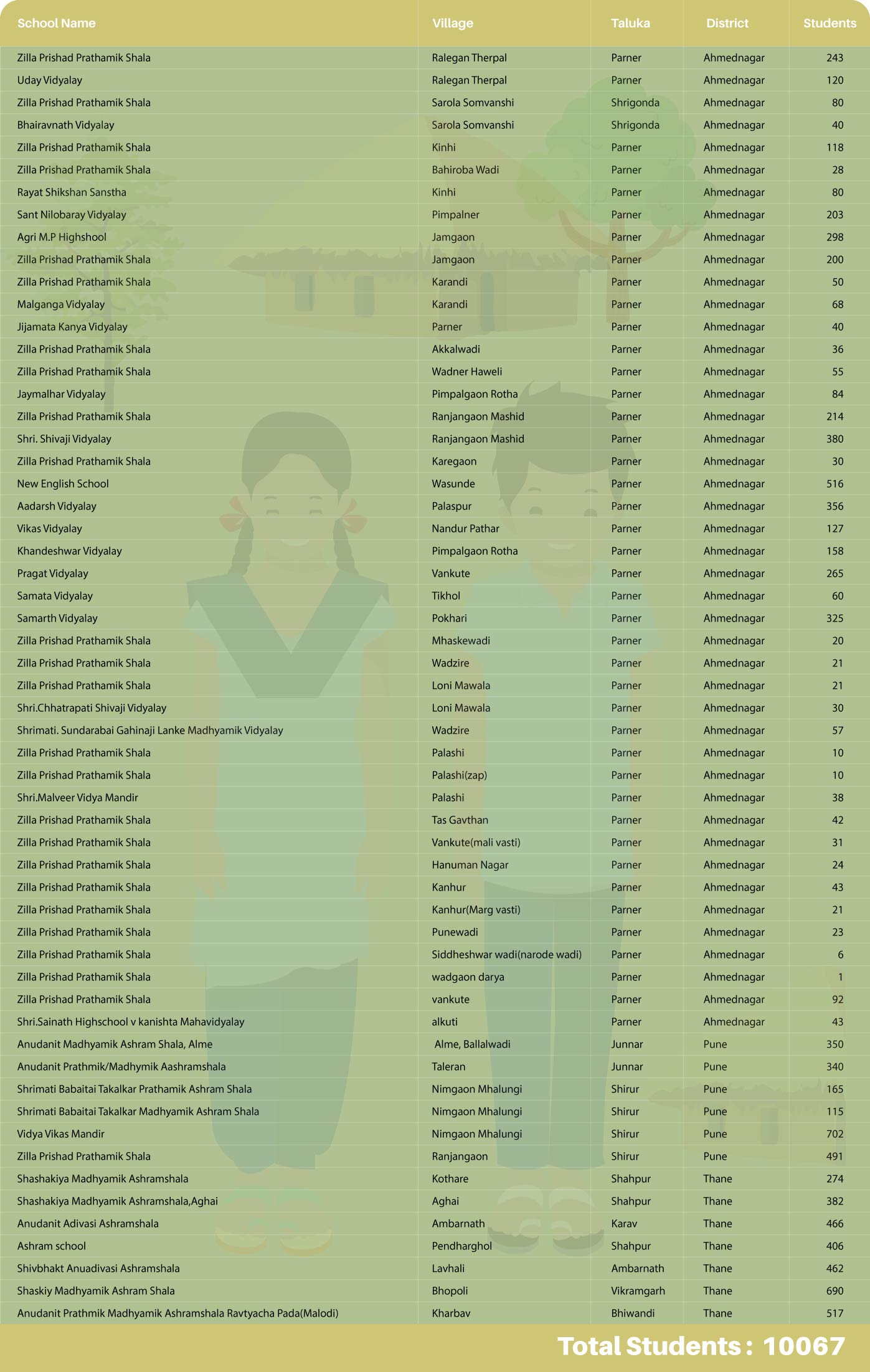 The below list totals to 26000 students across different schools across Maharashtra. We can distribute to more students if we raise more funds. This will help bring more smiles and cheers to students in rural schools.