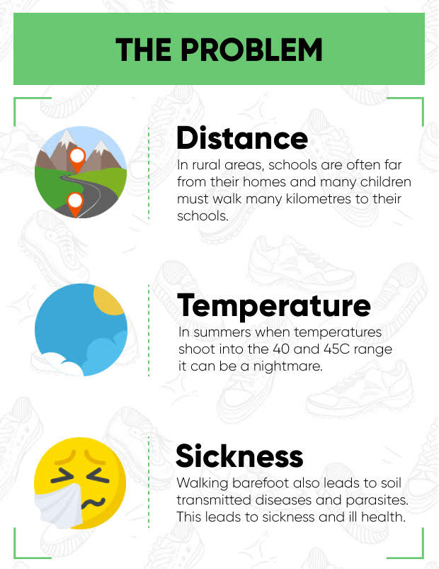 Lack of footwear makes this incredibly difficult and often is a chief reason for them to leave a school. Walking barefoot also leads to soil-transmitted diseases and parasites. This leads to sickness and ill health.