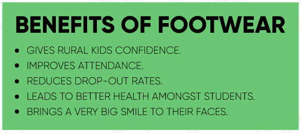 The lack of something as simple as footwear (along with school suppliers and toilets) is one of the principal reasons why children leave school. In the rural areas of Maharashtra, the schools are often far from their homes and many children must walk many kilometres to their schools. The walk is across roads, fields, narrow paths and is difficult and unsafe. In summers when temperatures shoot into the 40 and 45C range it can be a nightmare.