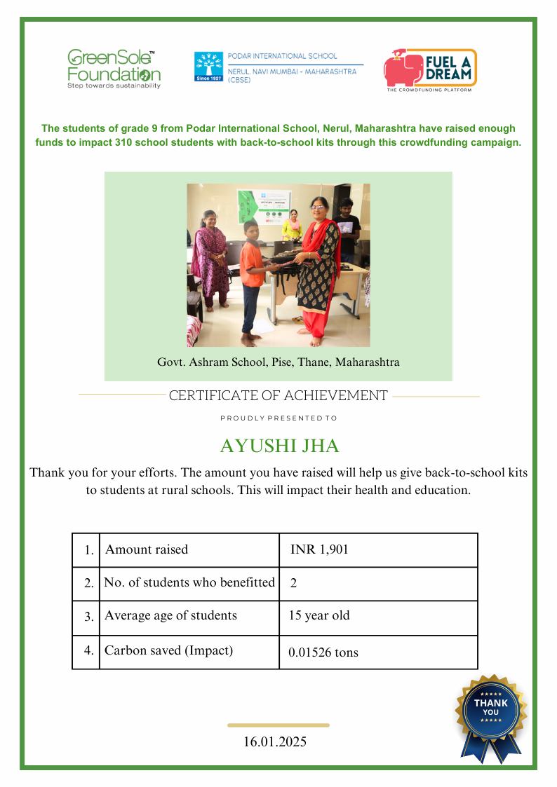 My name is AYUSHI JHA. I am 14-years-old and a Grade 9 student at the Podar International School (CBSE), Nerul, Navi Mumbai