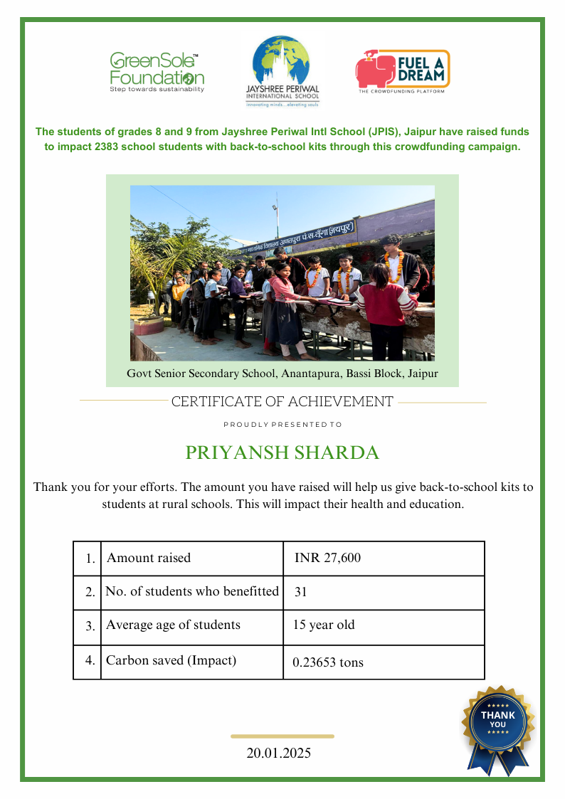 My name is PRIYANSH SHARDA. I am 13-years-old and a Grade 9 student at Jayshree Periwal Intl School, Jaipur (JPIS), Rajasthan.