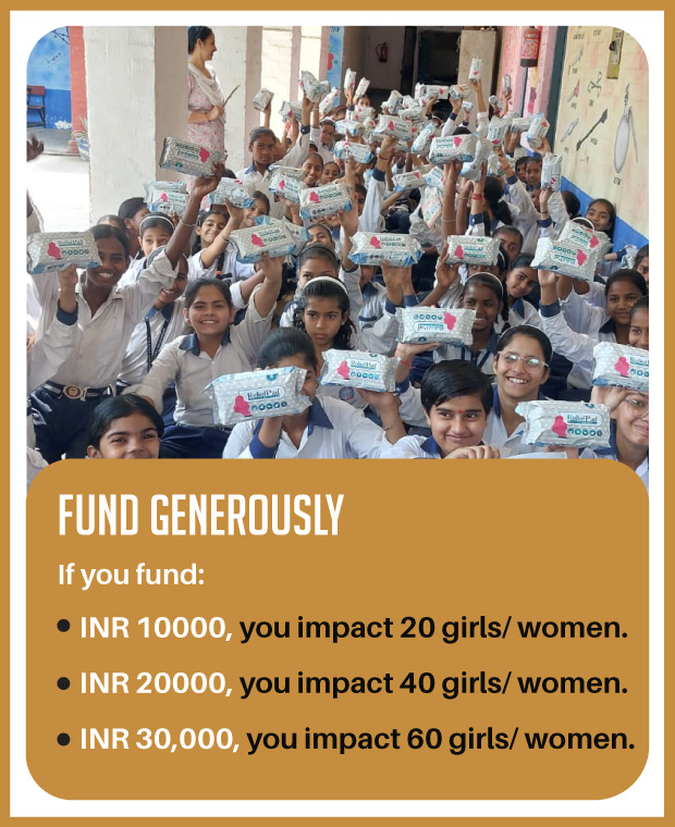 The cost of this hygiene kit (including distribution, training the women/girls, etc) is just INR 500 per pack of 5. The cost of distribution and training them is very high as it's done in small batches. Fund INR 1000 for example and you can impact 2 girls/women for 18-months. Isn't that wonderful !!