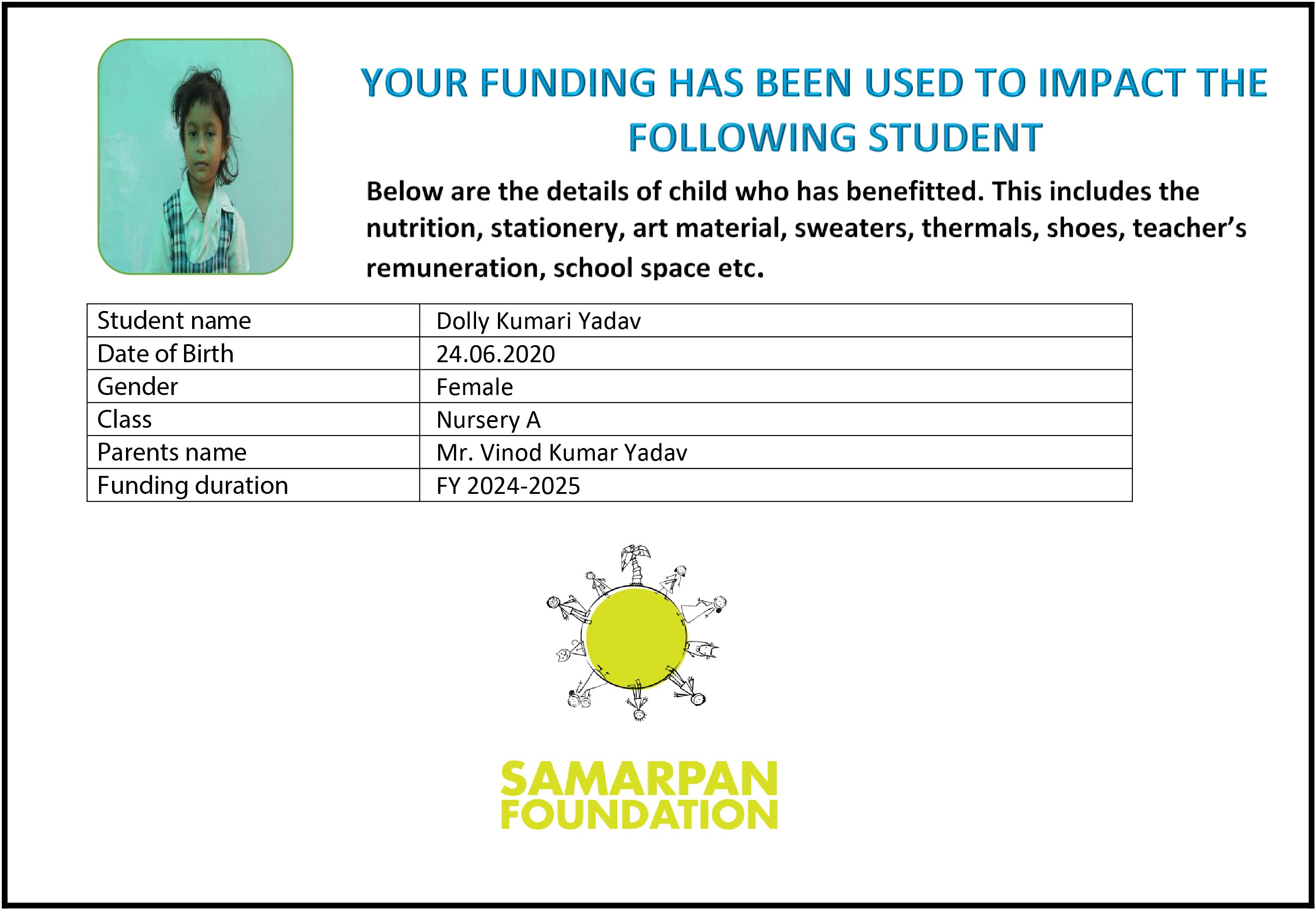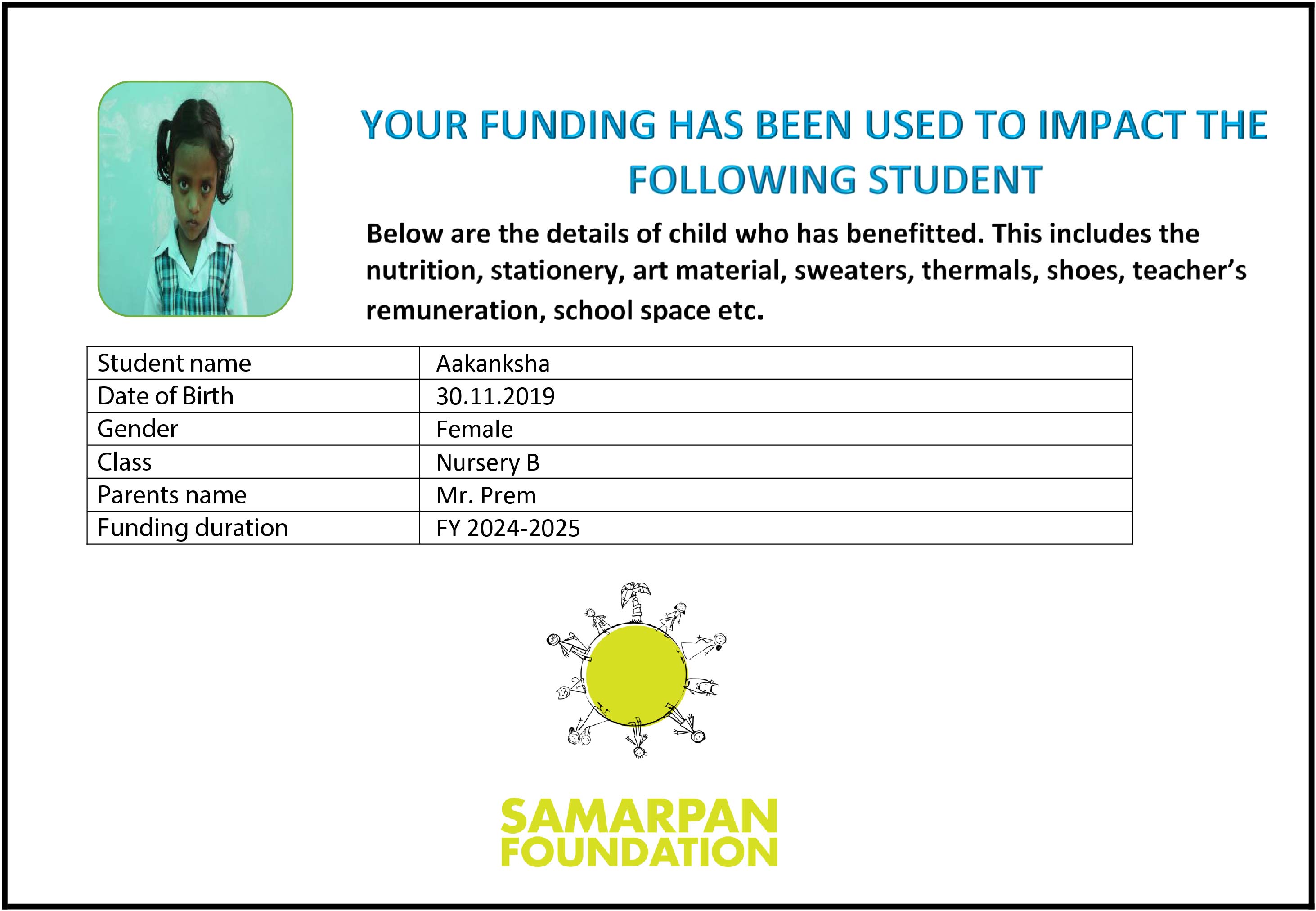 To ensure that there is complete transparency I shall get a report from SAMARPAN FOUNDATION This takes between 1 to 3 months usually after the funds are raised & transferred to them) telling me who benefitted from the funding. The details will then be posted on the UPDATES section of my campaign and will be in a format like the one below. As soon as I post an update the platform will send an EMAIL alert to all the funders. i.e. to you. Click on the link in the email and you can read about which child benefitted. That's transparent, right?