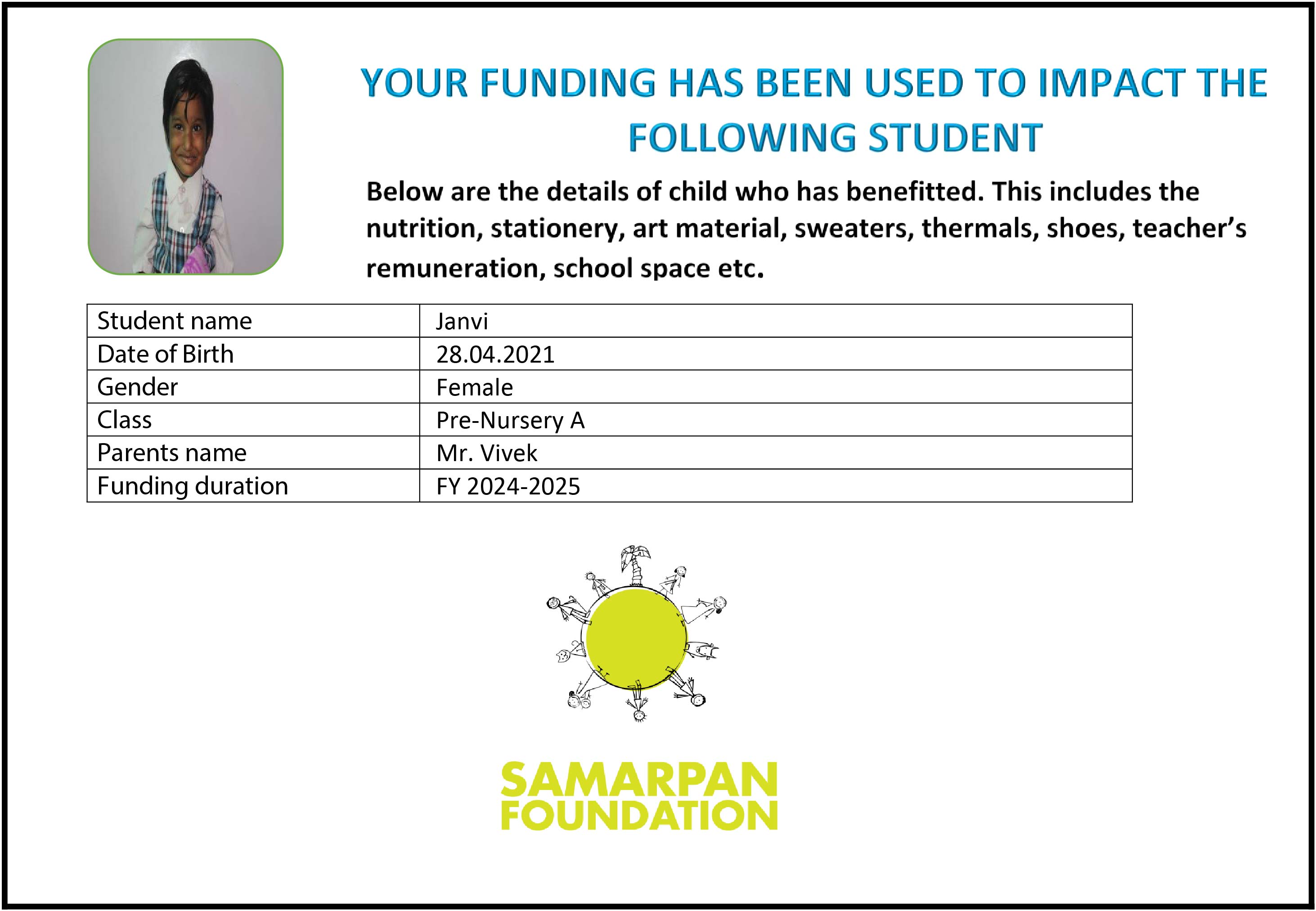 To ensure that there is complete transparency I shall get a report from SAMARPAN FOUNDATION This takes between 1 to 3 months usually after the funds are raised & transferred to them) telling me who benefitted from the funding. The details will then be posted on the UPDATES section of my campaign and will be in a format like the one below. As soon as I post an update the platform will send an EMAIL alert to all the funders. i.e. to you. Click on the link in the email and you can read about which child benefitted. That's transparent, right?