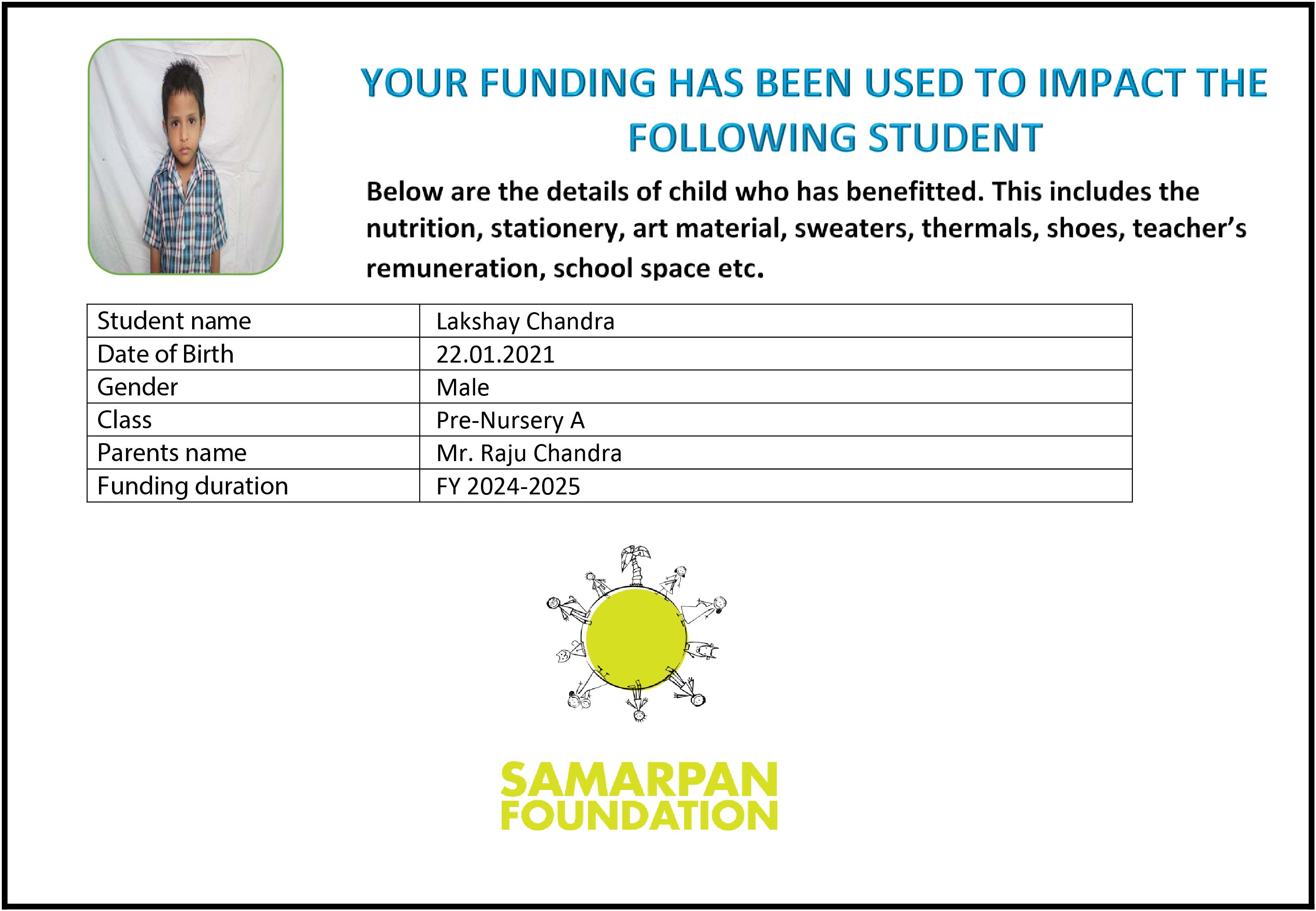 To ensure that there is complete transparency I shall get a report from SAMARPAN FOUNDATION This takes between 1 to 3 months usually after the funds are raised & transferred to them) telling me who benefitted from the funding. The details will then be posted on the UPDATES section of my campaign and will be in a format like the one below. As soon as I post an update the platform will send an EMAIL alert to all the funders. i.e. to you. Click on the link in the email and you can read about which child benefitted. That's transparent, right?