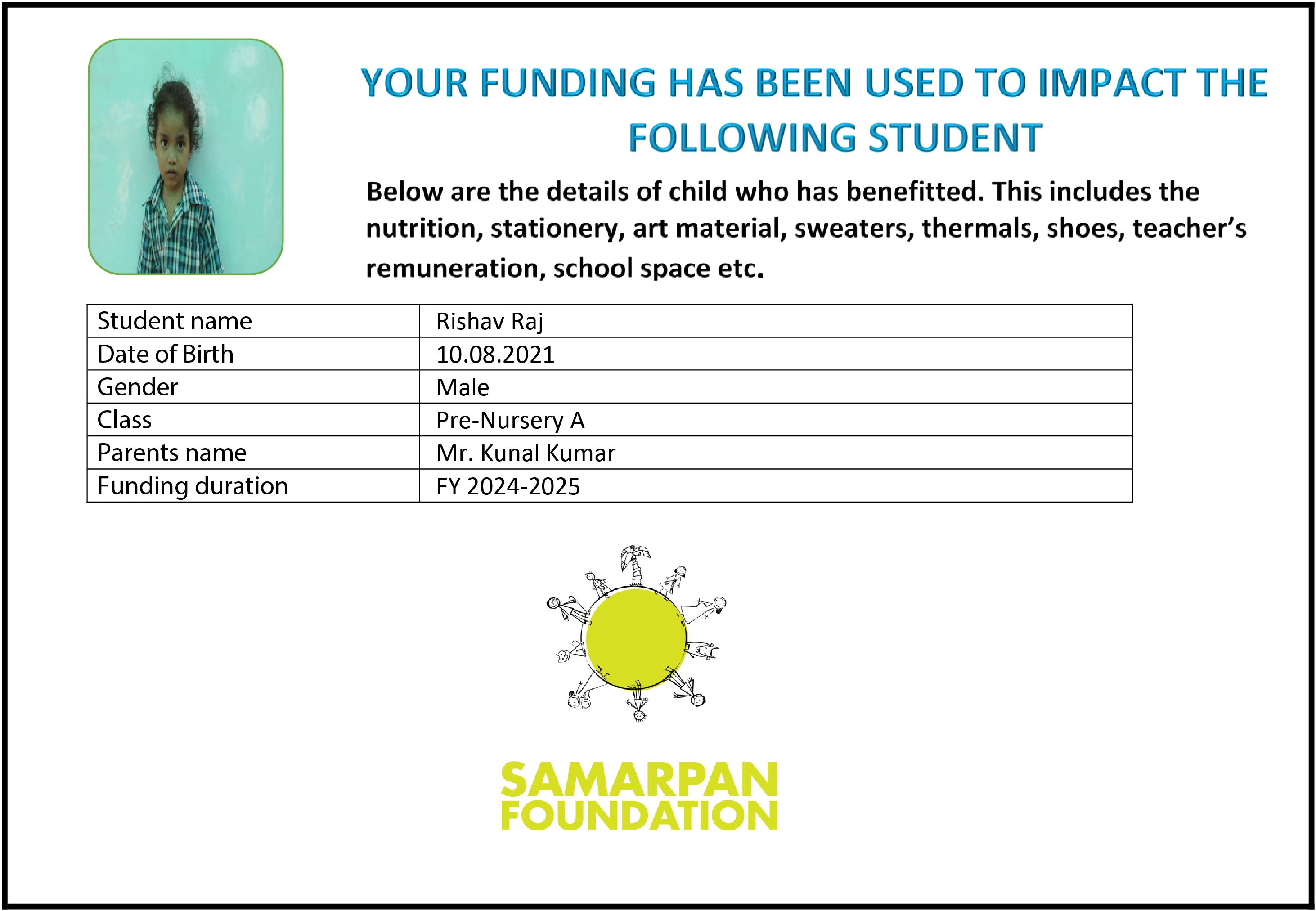 To ensure that there is complete transparency I shall get a report from SAMARPAN FOUNDATION This takes between 1 to 3 months usually after the funds are raised & transferred to them) telling me who benefitted from the funding. The details will then be posted on the UPDATES section of my campaign and will be in a format like the one below. As soon as I post an update the platform will send an EMAIL alert to all the funders. i.e. to you. Click on the link in the email and you can read about which child benefitted. That's transparent, right?