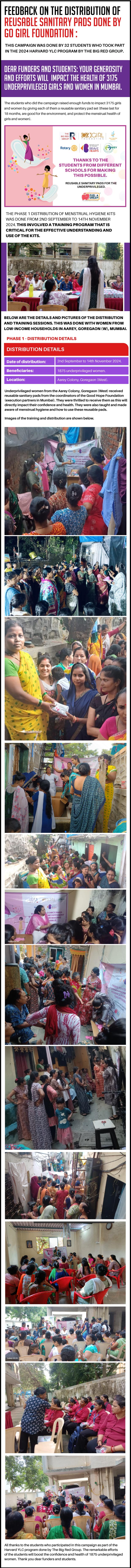 This initiative is done in partnership with the NGO - Go Girl Foundation and also with the Mumbai based NGO - People for Good Hope Foundation. They will provide “Reusable sanitary pads” to these underprivileged women and girls. Each kit is unique as it contains 5 reusable sanitary pads - 2 for heavy flow and 3 for normal flow. The pads will last easily for 18 months, are environment-friendly, easy to store, and most importantly cost-effective.