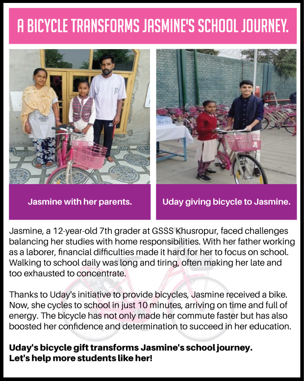 To help these girls, we have launched a campaign to provide them with bicycles. These bicycles, sourced from Nova Bicycle Industries in Janta Nagar, Ludhiana, are of the NOVA brand. Each bicycle costs approximately INR 4000.