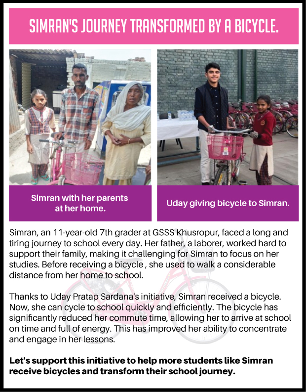 My name is YOHAAN MARDA. I am a Grade 10 student at The Doon School, Dehradun. I am passionate about making a difference in the lives of girls - particularly those facing challenges in getting to their school as they have to walk long distances in rural Punjab.