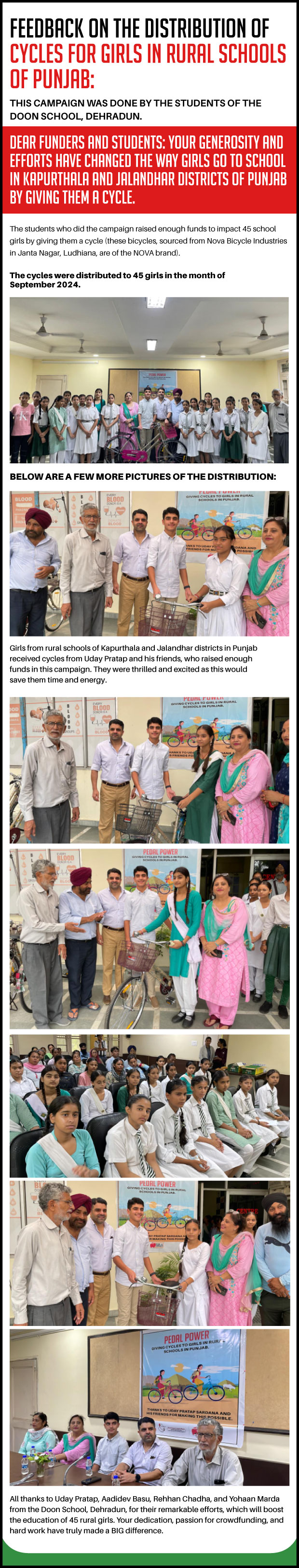 My name is REHHAN CHADHA. I am a Grade 10 student at The Doon School, Dehradun. I am passionate about making a difference in the lives of girls - particularly those facing challenges in getting to their school as they have to walk long distances in rural Punjab.