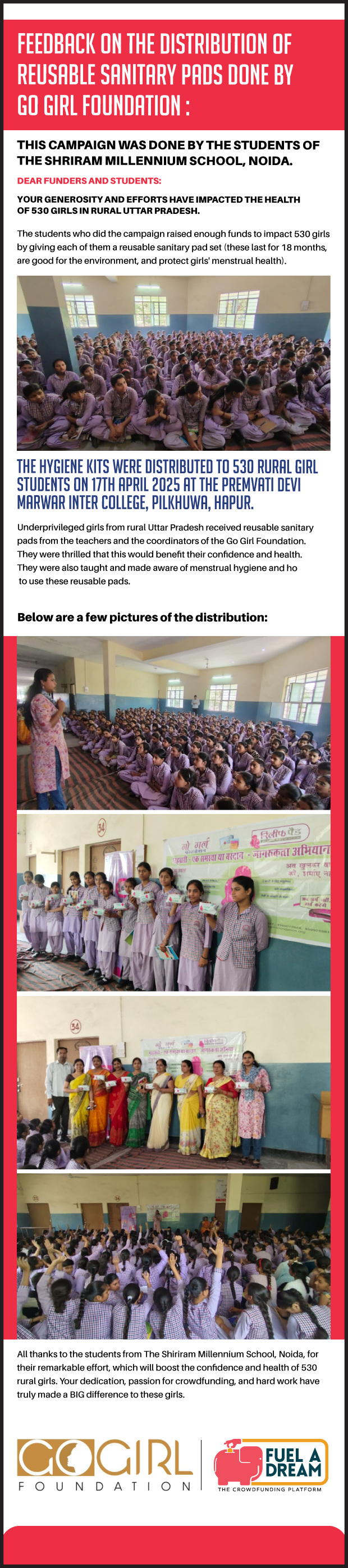 Funding for this campaign is eligible for tax breaks as GO GIRL FOUNDATION is a registered NGO and you can avail of benefits under section 80G of the IT Act. Foreign funding is NOT accepted.