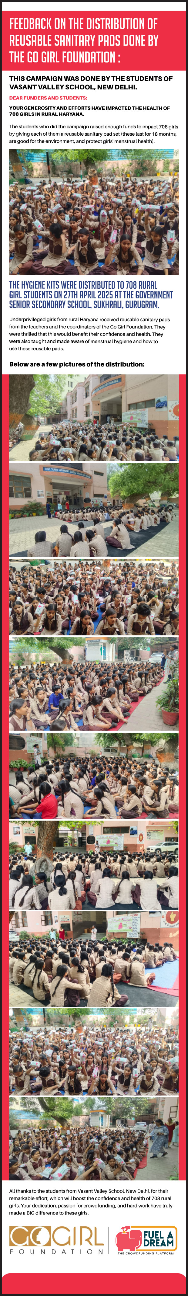 Funding for this campaign is eligible for tax breaks as GO GIRL FOUNDATION is a registered NGO and you can avail of benefits under section 80G of the IT Act. Foreign funding is NOT accepted.