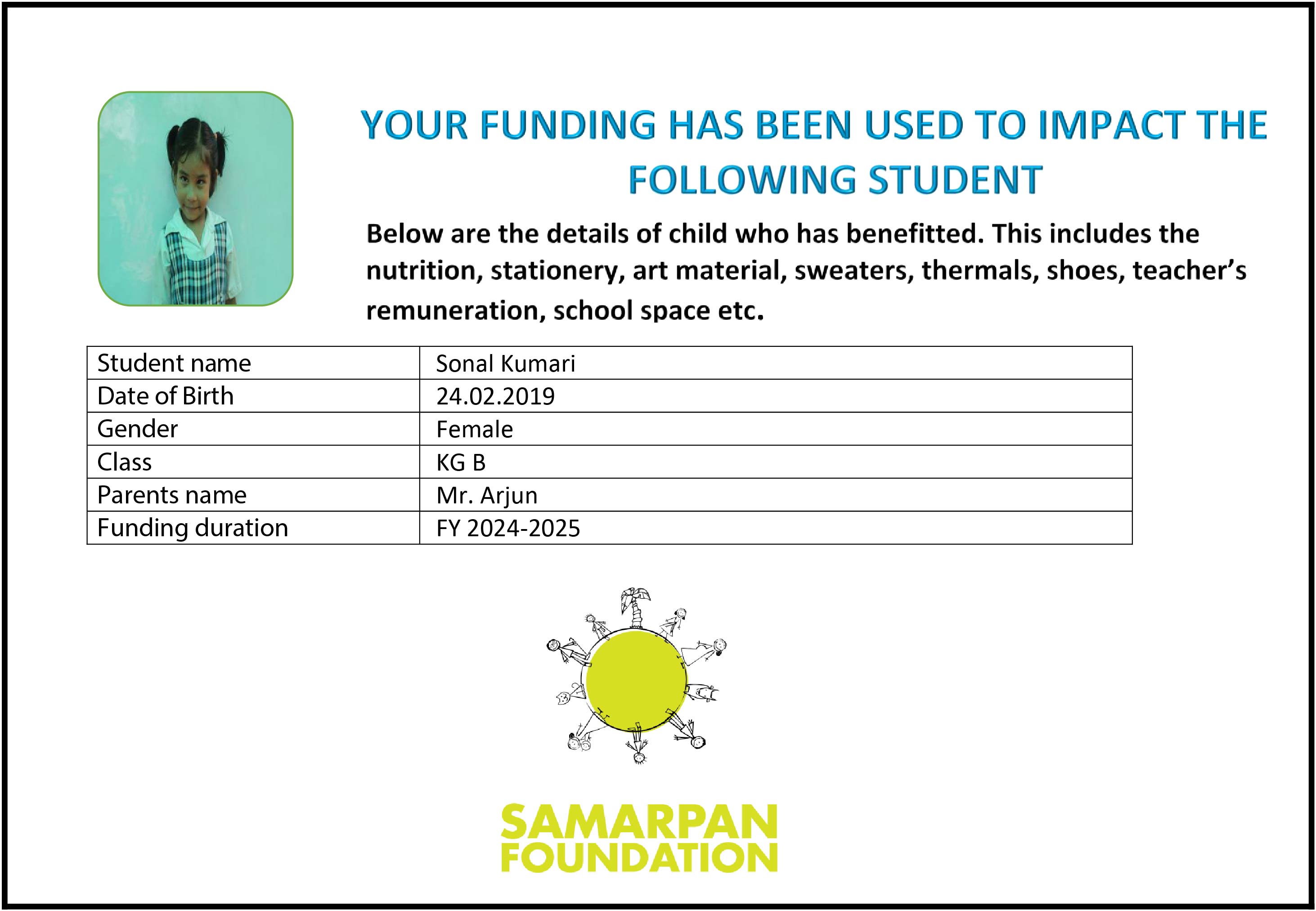 To ensure that there is complete transparency I shall get a report from SAMARPAN FOUNDATION This takes between 1 to 3 months usually after the funds are raised & transferred to them) telling me who benefitted from the funding. The details will then be posted on the UPDATES section of my campaign and will be in a format like the one below. As soon as I post an update the platform will send an EMAIL alert to all the funders. i.e. to you. Click on the link in the email and you can read about which child benefitted. That's transparent, right?