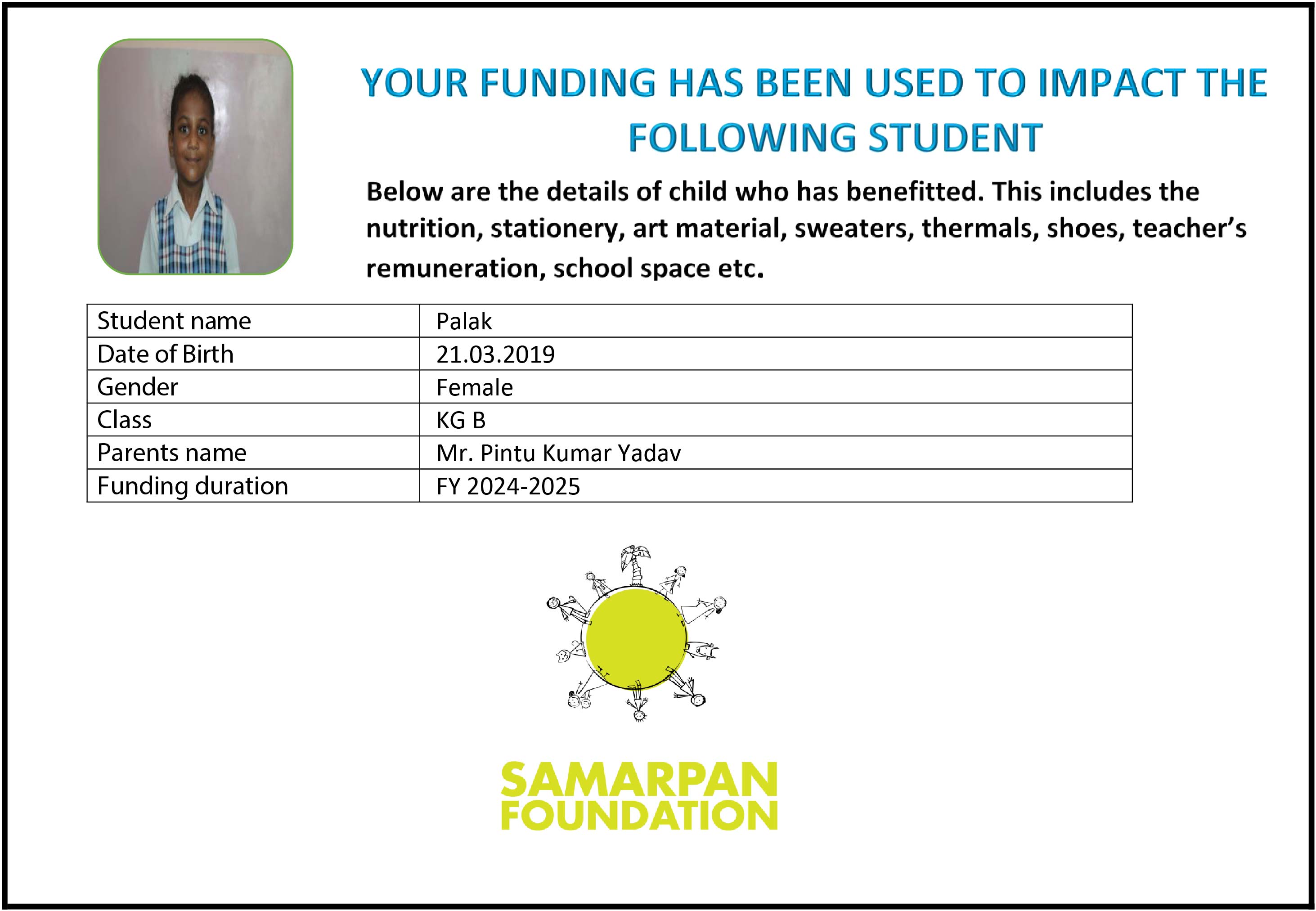 To ensure that there is complete transparency I shall get a report from SAMARPAN FOUNDATION This takes between 1 to 3 months usually after the funds are raised & transferred to them) telling me who benefitted from the funding. The details will then be posted on the UPDATES section of my campaign and will be in a format like the one below. As soon as I post an update the platform will send an EMAIL alert to all the funders. i.e. to you. Click on the link in the email and you can read about which child benefitted. That's transparent, right?