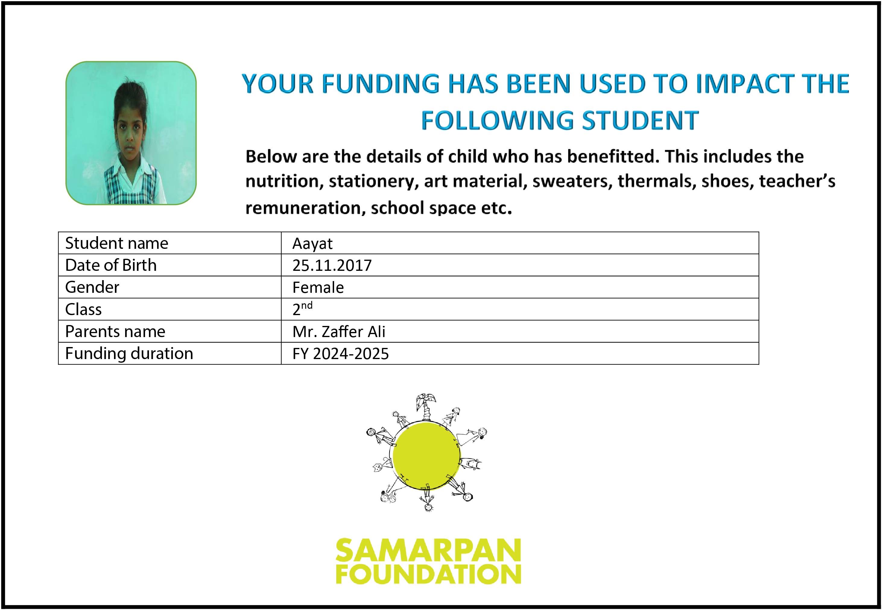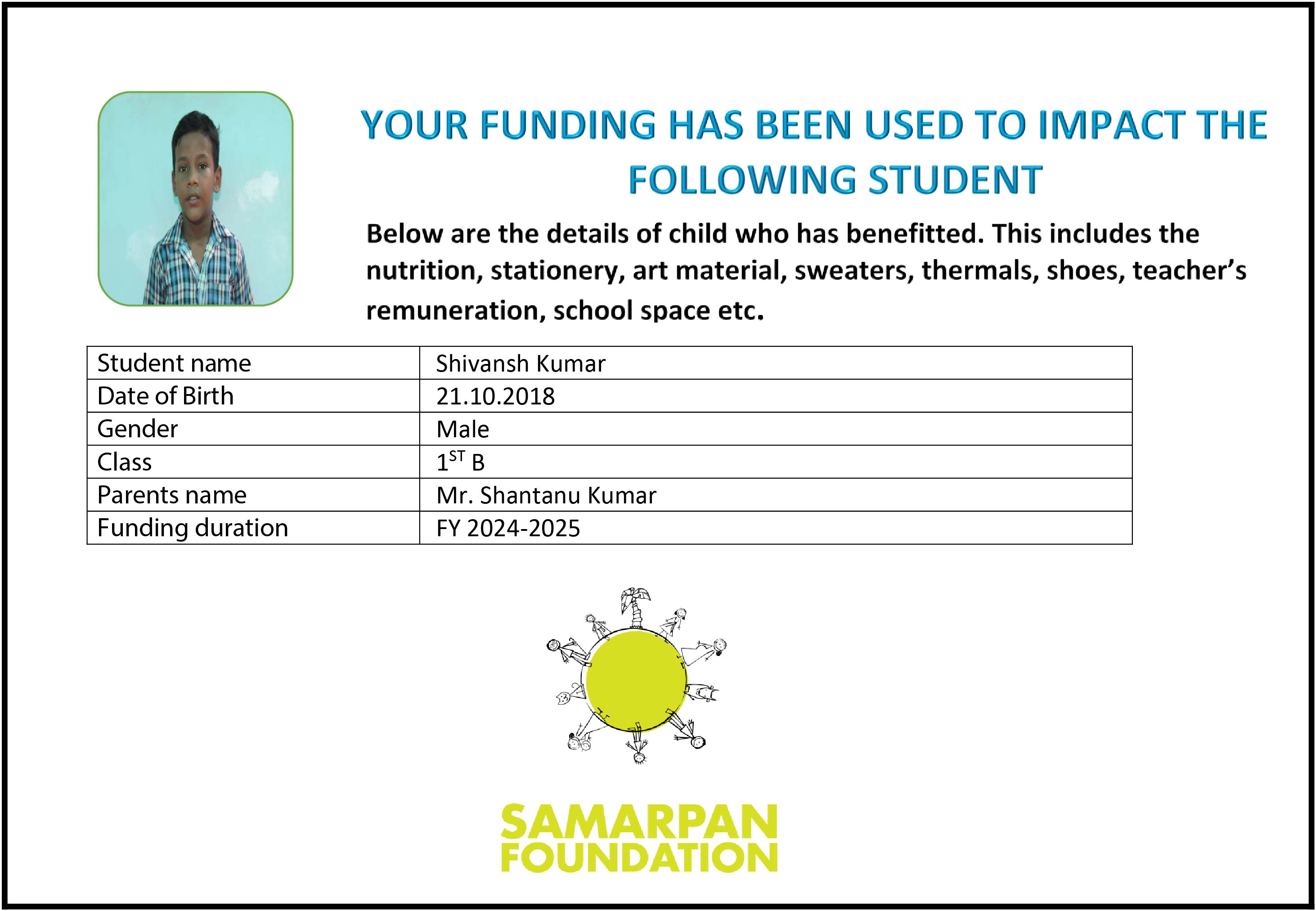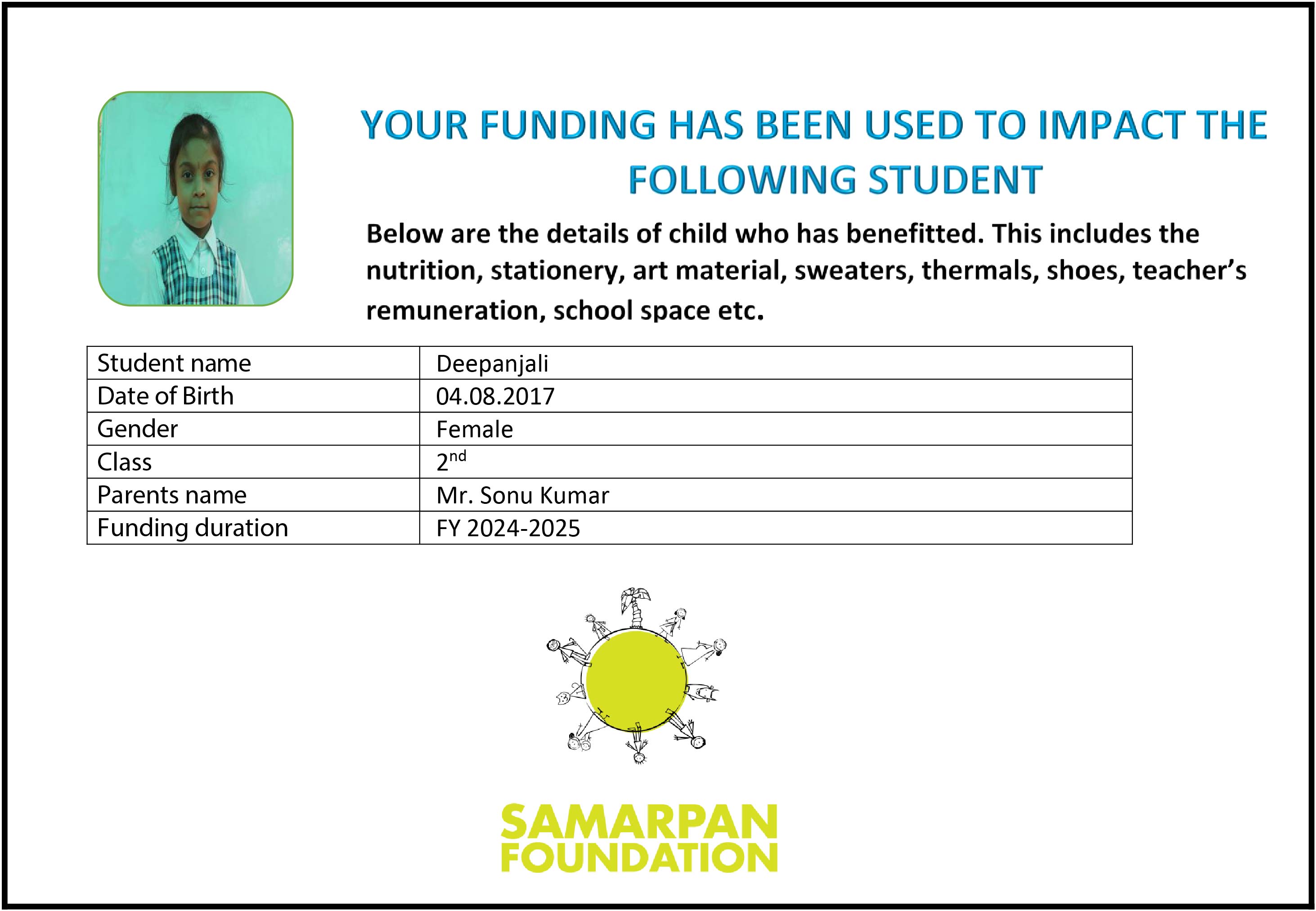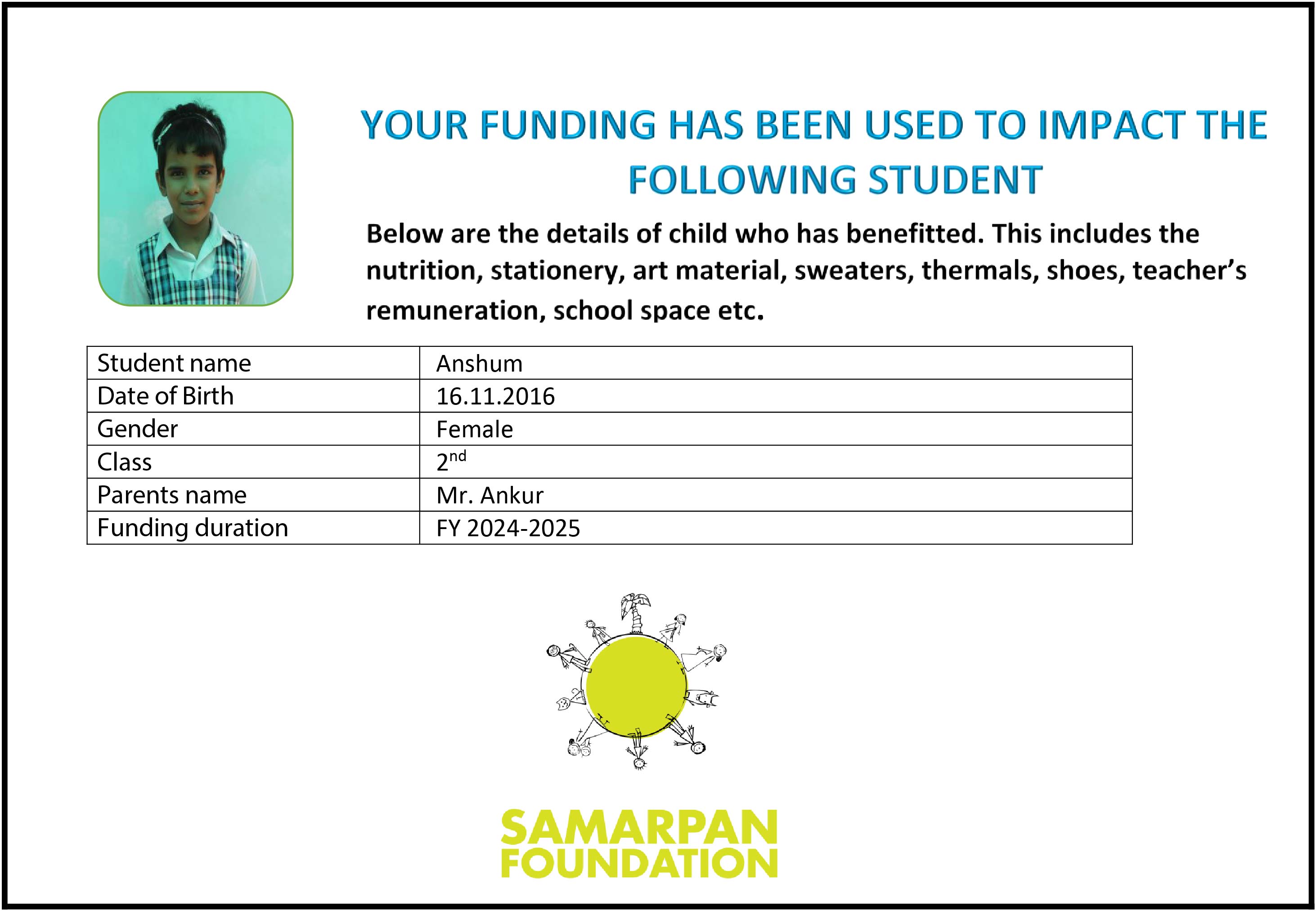 To ensure that there is complete transparency I shall get a report from SAMARPAN FOUNDATION This takes between 1 to 3 months usually after the funds are raised & transferred to them) telling me who benefitted from the funding. The details will then be posted on the UPDATES section of my campaign and will be in a format like the one below. As soon as I post an update the platform will send an EMAIL alert to all the funders. i.e. to you. Click on the link in the email and you can read about which child benefitted. That's transparent, right?