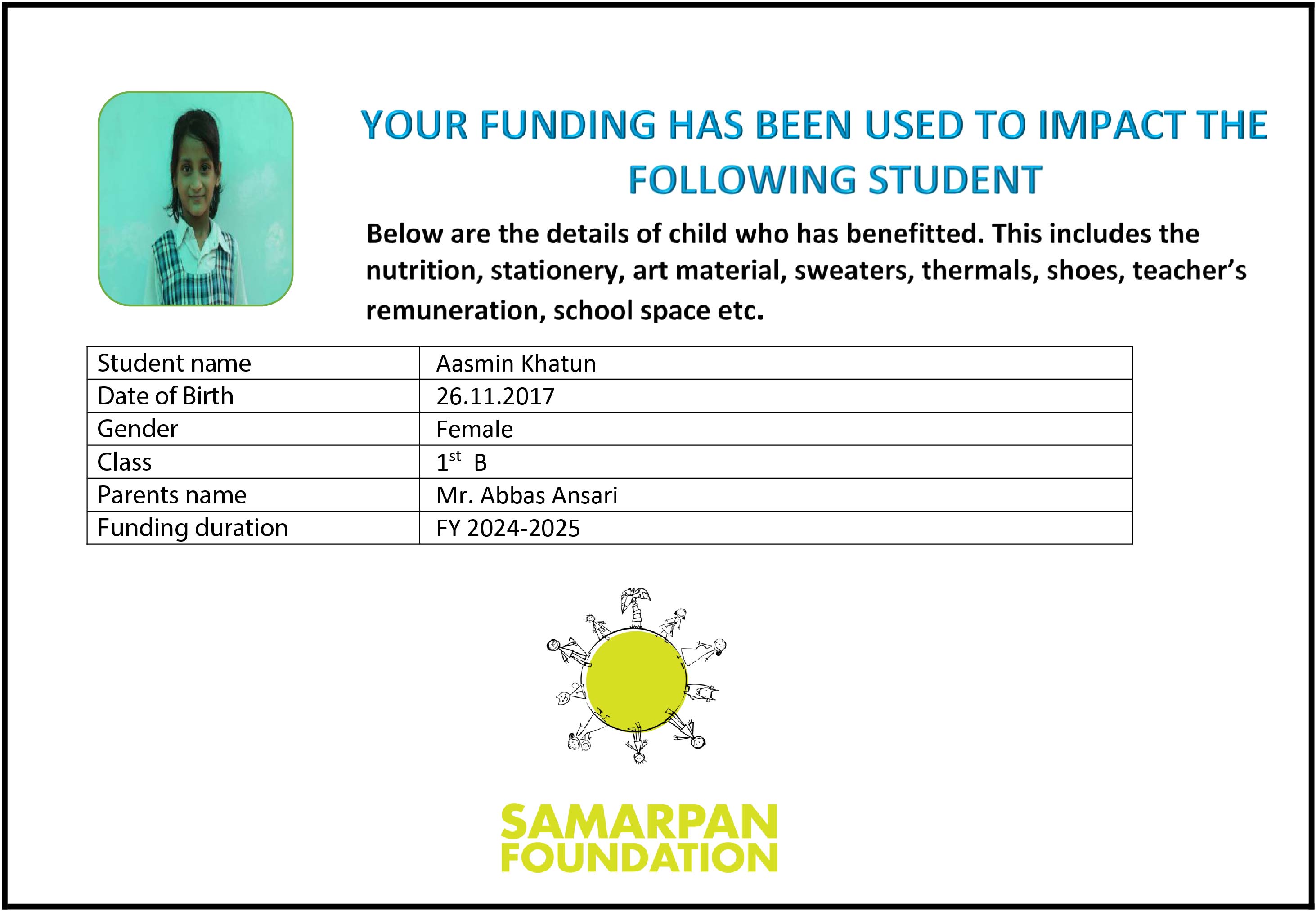 To ensure that there is complete transparency I shall get a report from SAMARPAN FOUNDATION This takes between 1 to 3 months usually after the funds are raised & transferred to them) telling me who benefitted from the funding. The details will then be posted on the UPDATES section of my campaign and will be in a format like the one below. As soon as I post an update the platform will send an EMAIL alert to all the funders. i.e. to you. Click on the link in the email and you can read about which child benefitted. That's transparent, right?