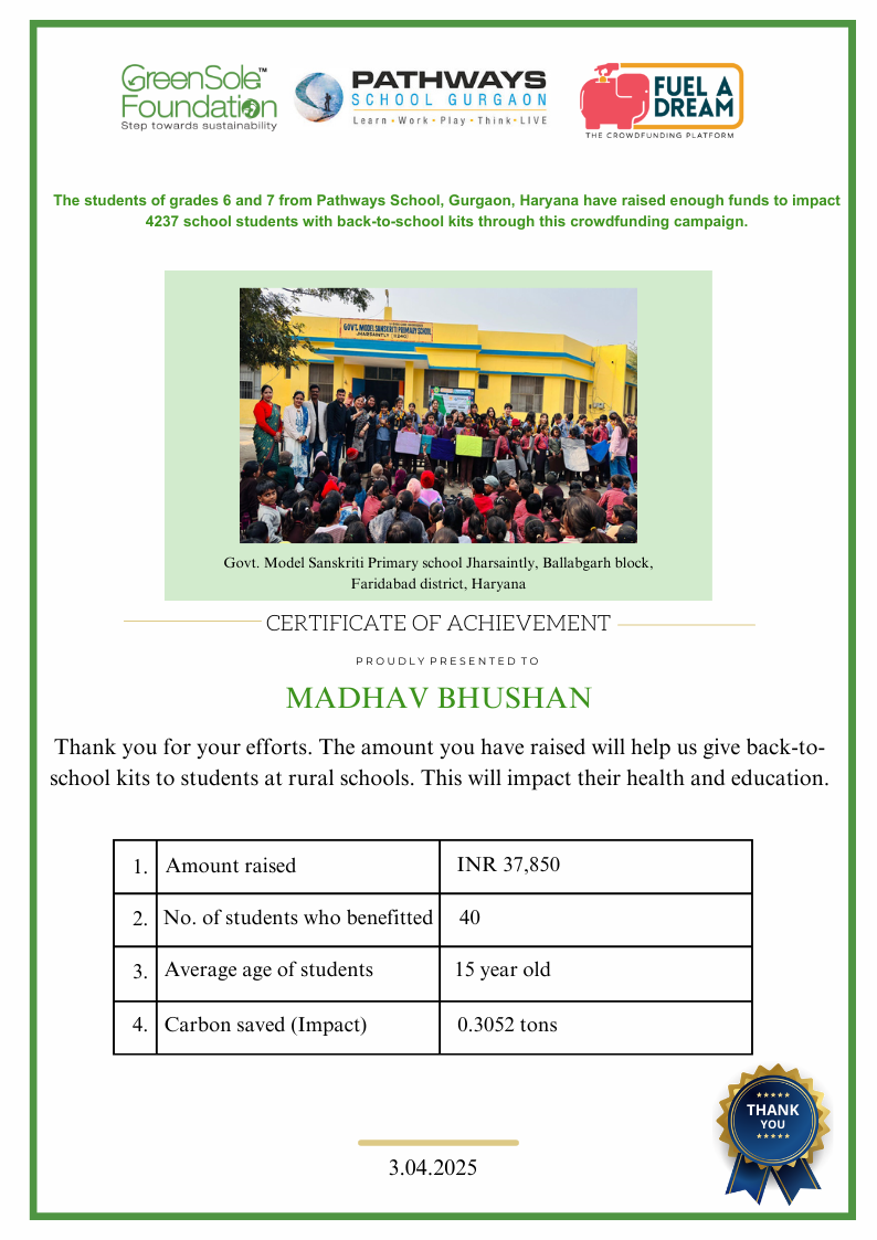 I have undertaken this campaign because I was surprised to learn that many students from low-income homes in Haryana, who go to school (mainly govt schools) do not have basic school gear like proper footwear or a school bag and often sit on the hard ground in order to study at school.