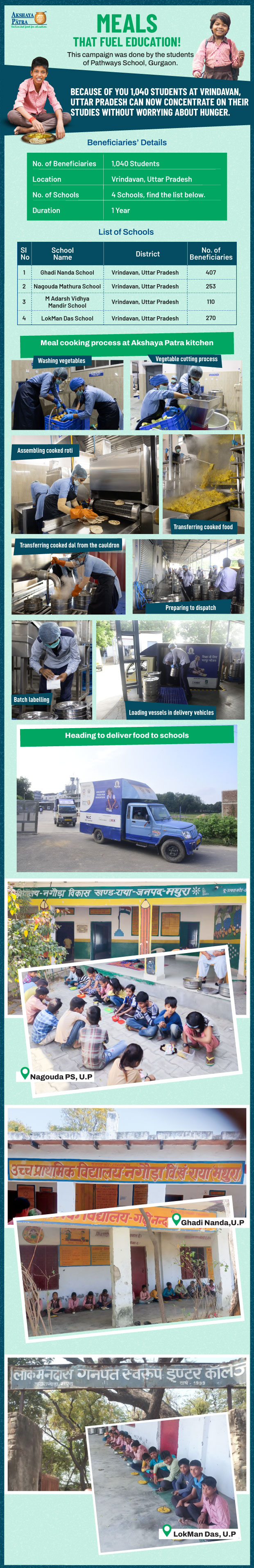 The Mid-day meal will be distributed to 2,52,938 children in 3,543 schools across Uttar Pradesh. We can provide mid-day meals for more students if we raise more funds. This will help bring more smiles and cheers to students and help us achieve the Foundation’s Vision that ‘’No child in India shall be deprived of Education, because of Hunger’’.