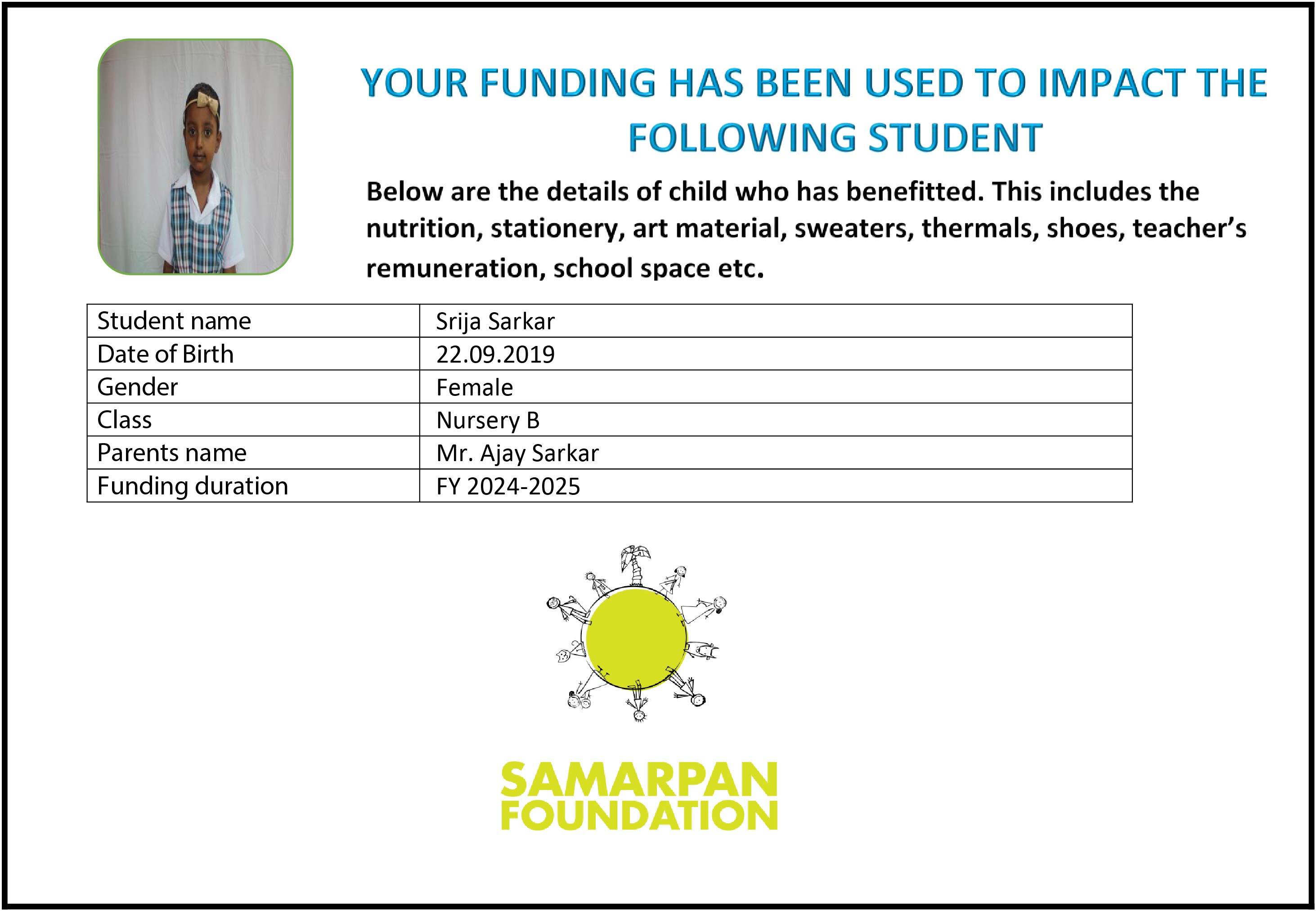 To ensure that there is complete transparency I shall get a report from SAMARPAN FOUNDATION This takes between 1 to 3 months usually after the funds are raised & transferred to them) telling me who benefitted from the funding. The details will then be posted on the UPDATES section of my campaign and will be in a format like the one below. As soon as I post an update the platform will send an EMAIL alert to all the funders. i.e. to you. Click on the link in the email and you can read about which child benefitted. That's transparent, right?