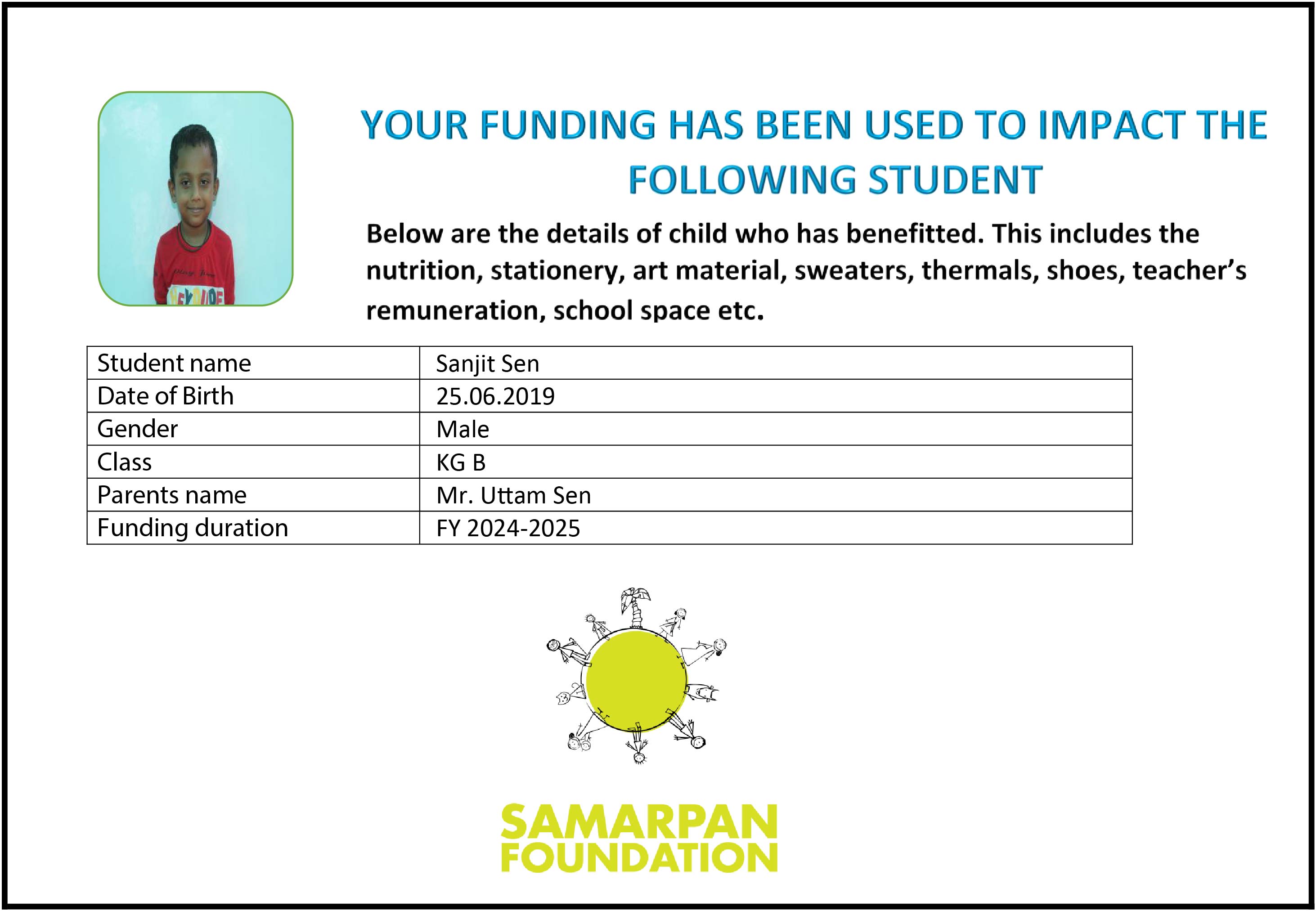 To ensure that there is complete transparency I shall get a report from SAMARPAN FOUNDATION This takes between 1 to 3 months usually after the funds are raised & transferred to them) telling me who benefitted from the funding. The details will then be posted on the UPDATES section of my campaign and will be in a format like the one below. As soon as I post an update the platform will send an EMAIL alert to all the funders. i.e. to you. Click on the link in the email and you can read about which child benefitted. That's transparent, right?