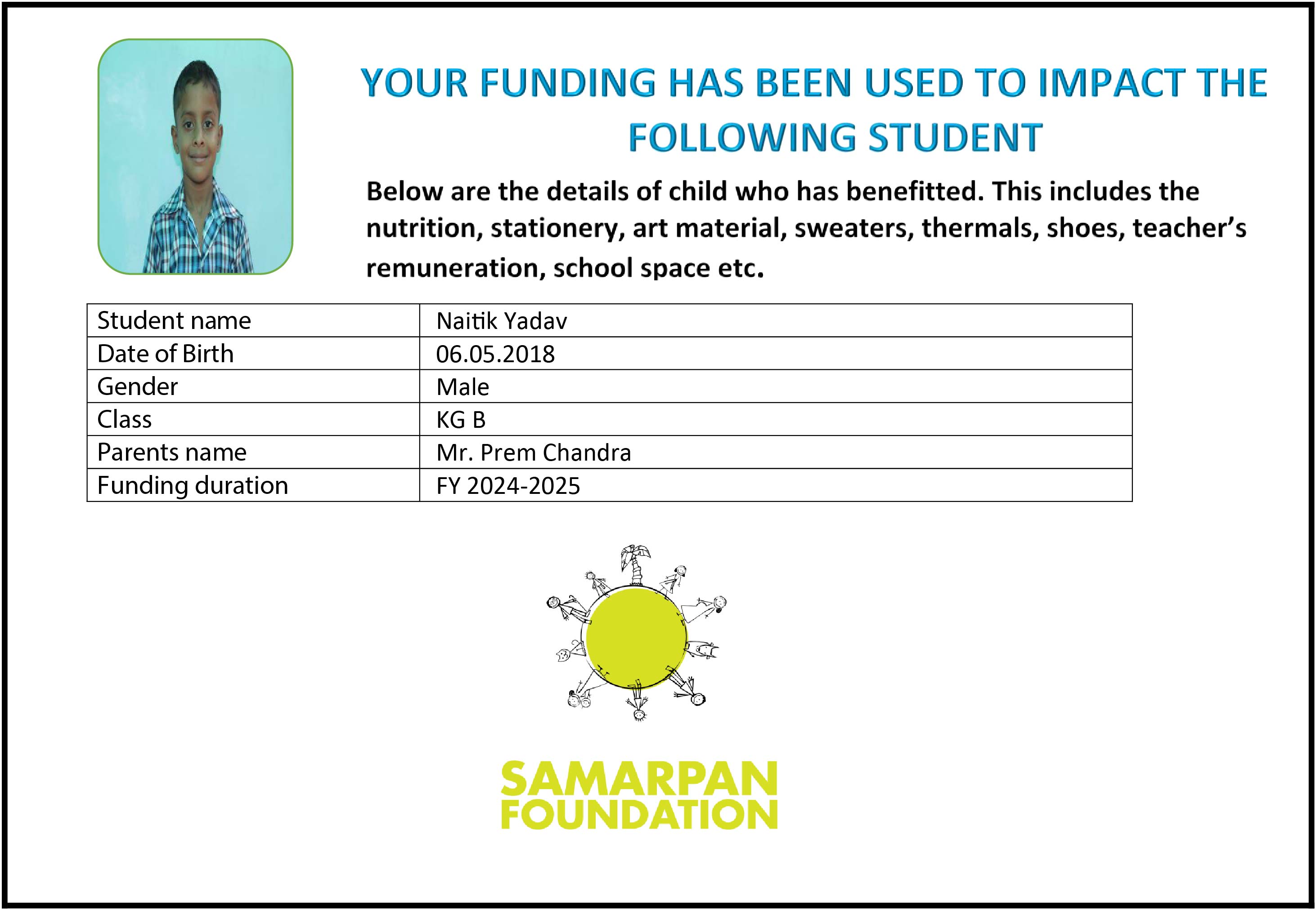 To ensure that there is complete transparency I shall get a report from SAMARPAN FOUNDATION This takes between 1 to 3 months usually after the funds are raised & transferred to them) telling me who benefitted from the funding. The details will then be posted on the UPDATES section of my campaign and will be in a format like the one below. As soon as I post an update the platform will send an EMAIL alert to all the funders. i.e. to you. Click on the link in the email and you can read about which child benefitted. That's transparent, right?