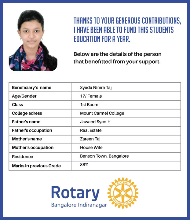 To ensure that there is complete transparency, the team at ROTARY BANGALORE INDIRANAGAR will post feedback about 4-5 months after the campaign gets over telling us which student has received the scholarship. This takes some time as they need to screen candidates and allocate them to me. The details will then be posted in the UPDATES section of my campaign and will be in a format like the one below. As soon as I post an update the platform will send an EMAIL alert to you. Click on the link and you can read about which child has benefitted. That's transparent right?