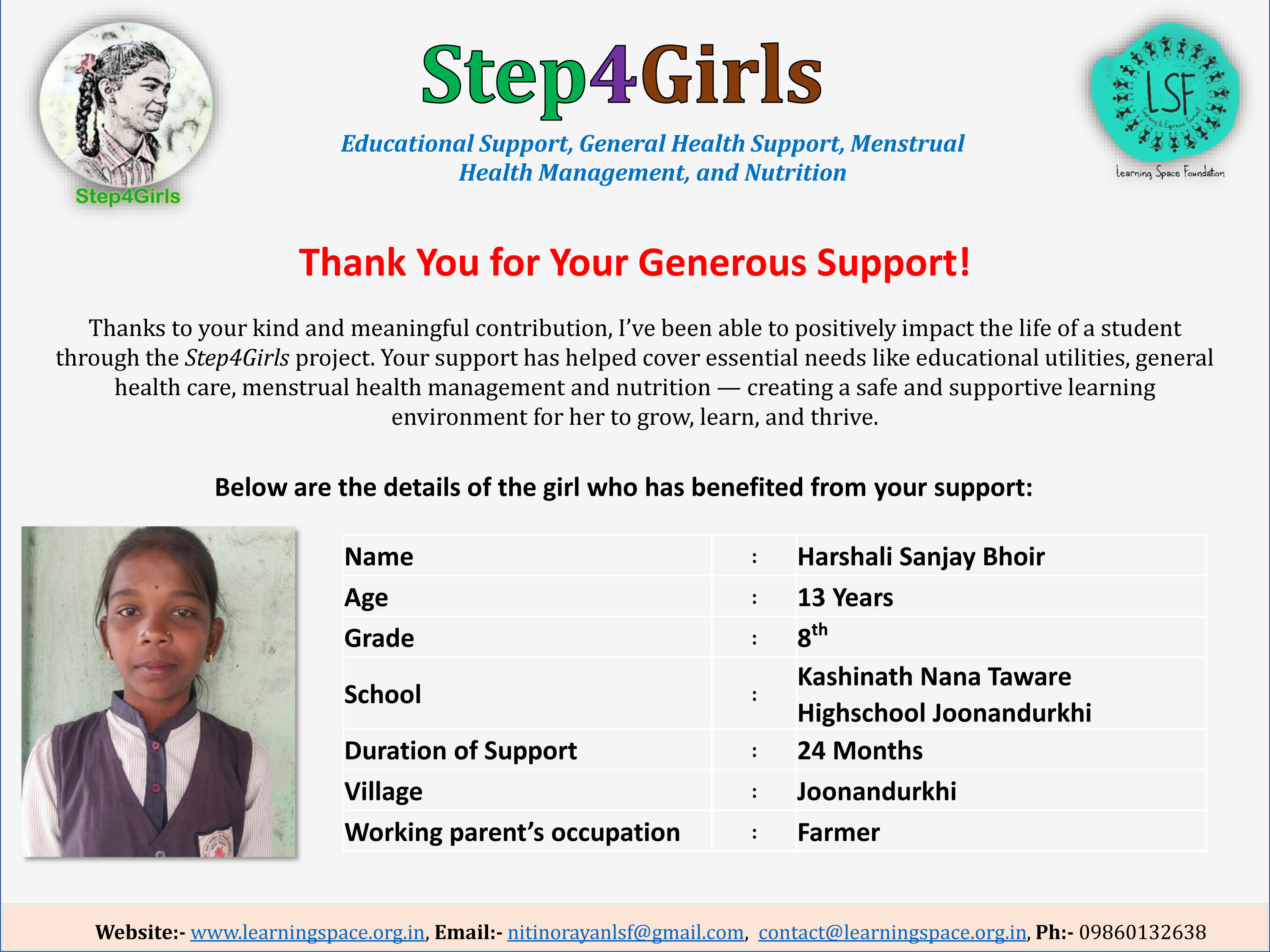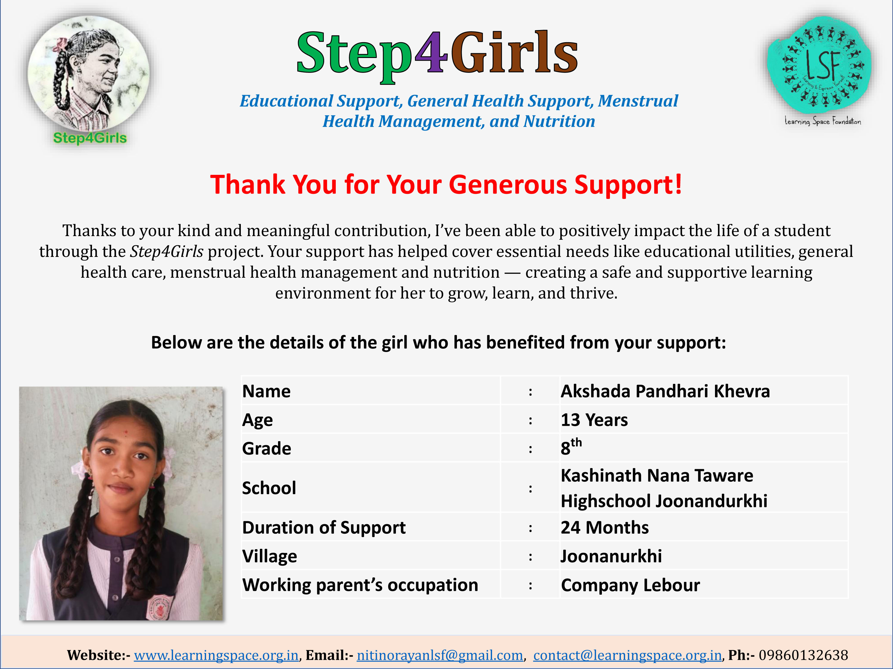 Please support my campaign as a simple act of kindness can have a profound impact on a girl's life. Let us together lend a helping hand and transform their lives.